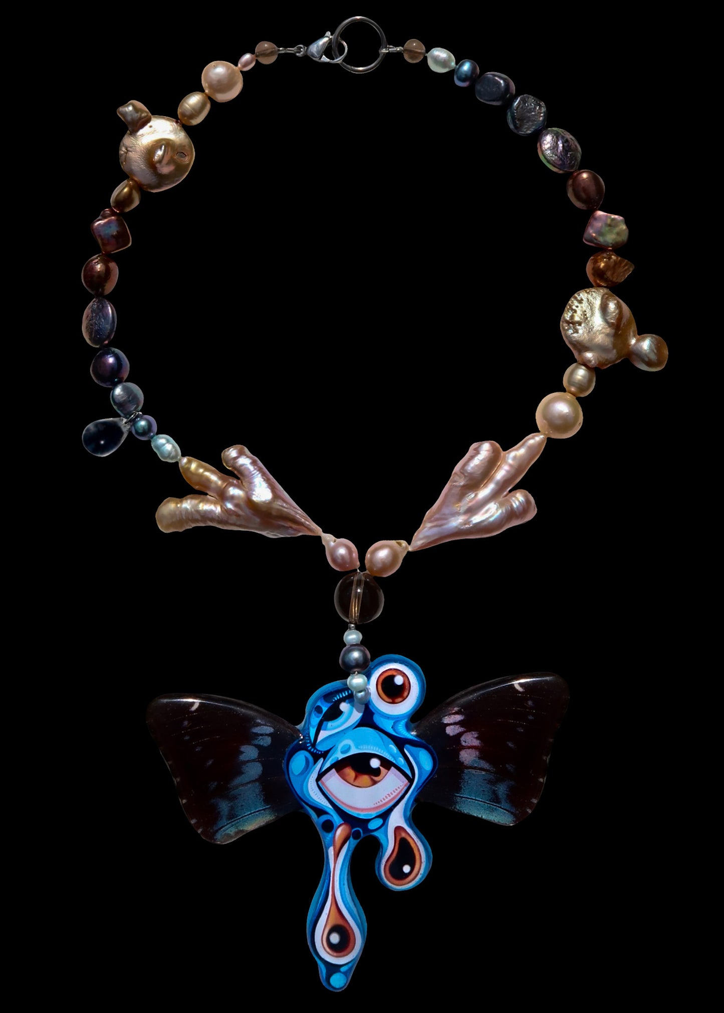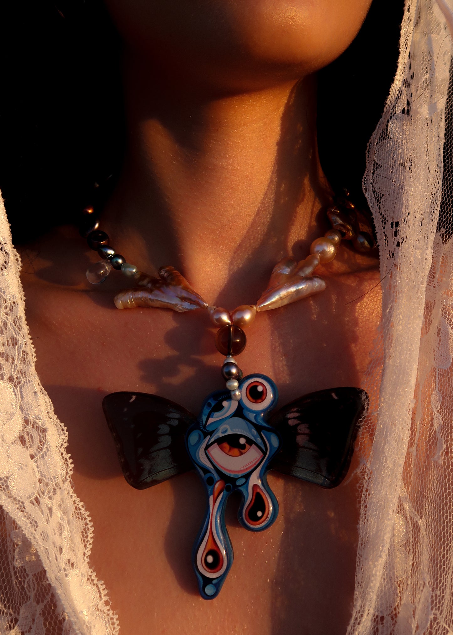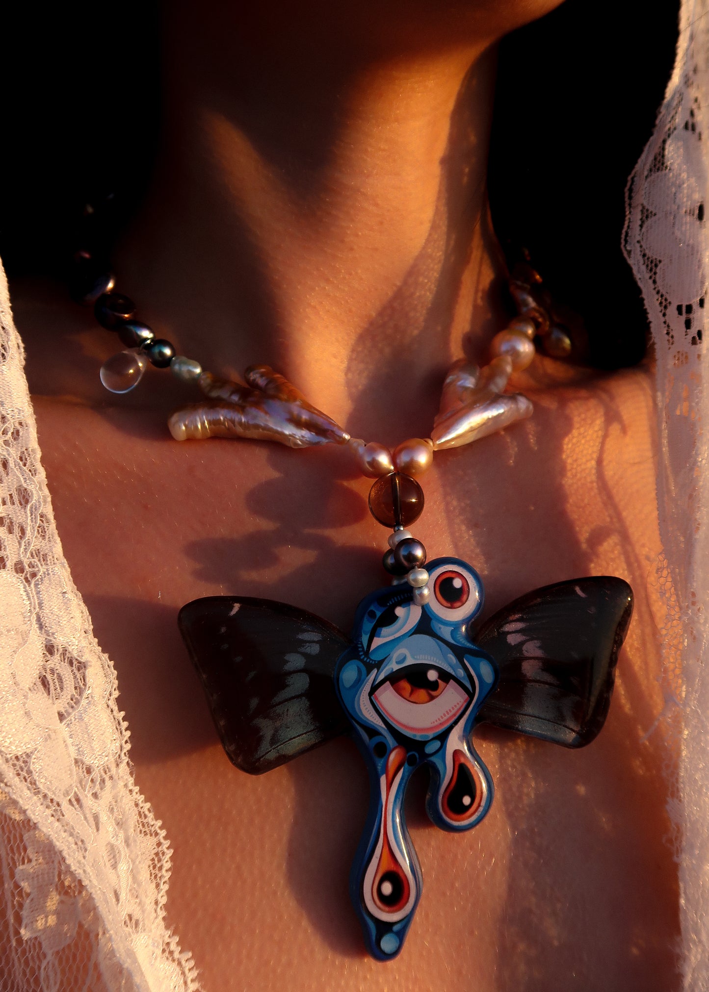 Created with a variety of Genuine Freshwater Pearls, Glass Beads, Hand-made pendant, Real butterfly wings & Stainless Steel finishes.