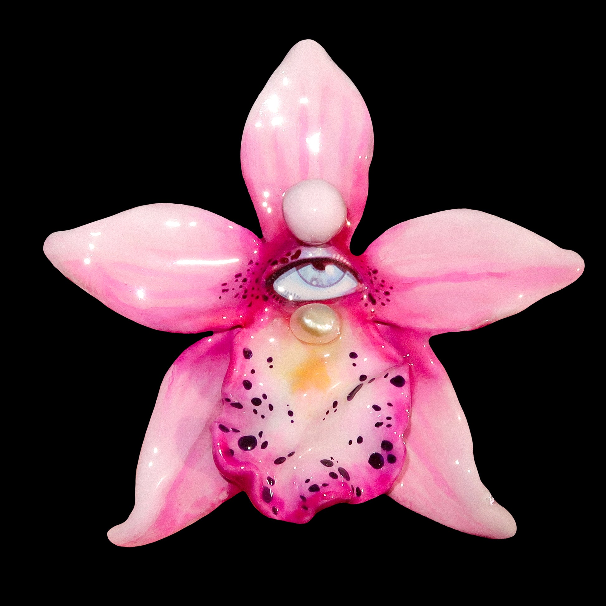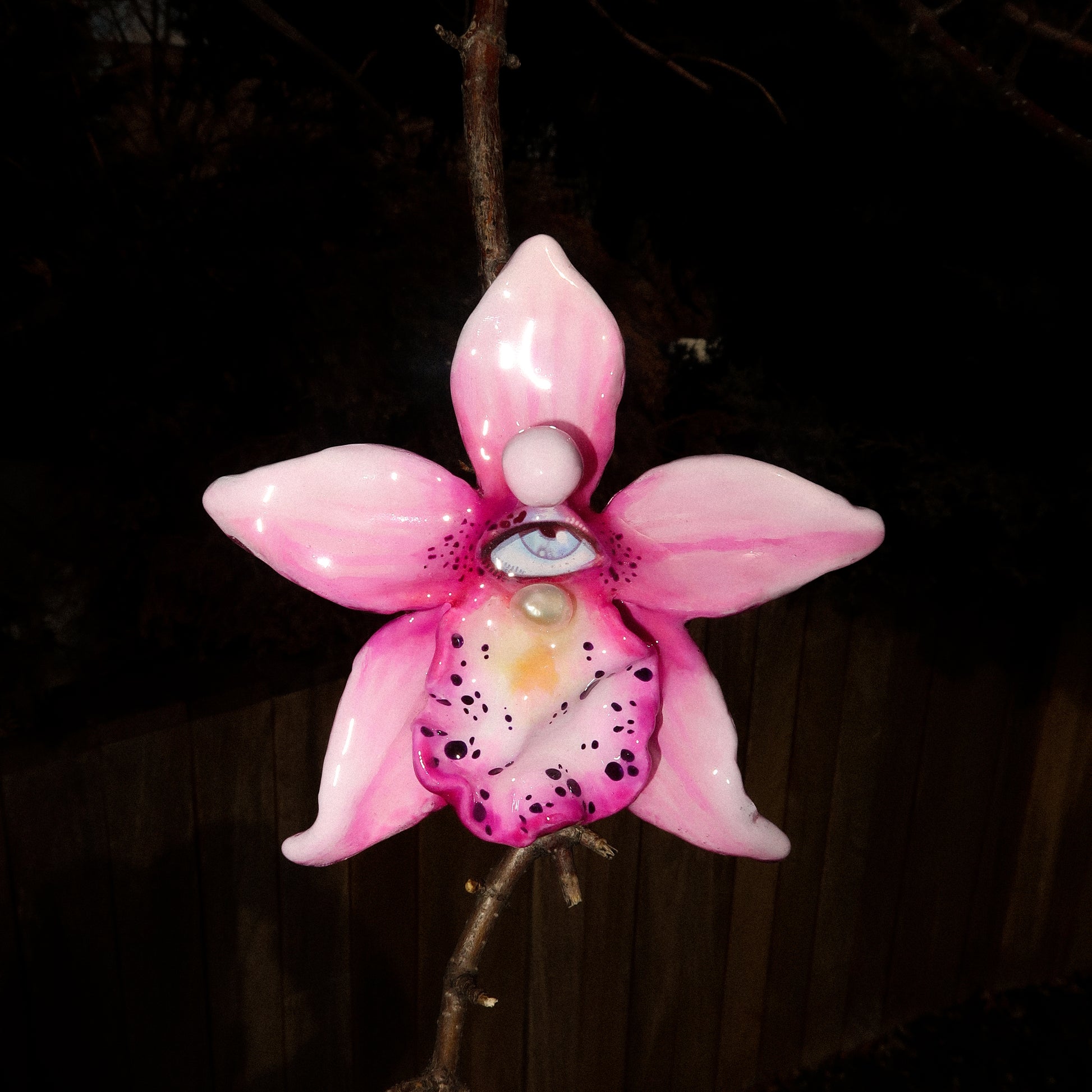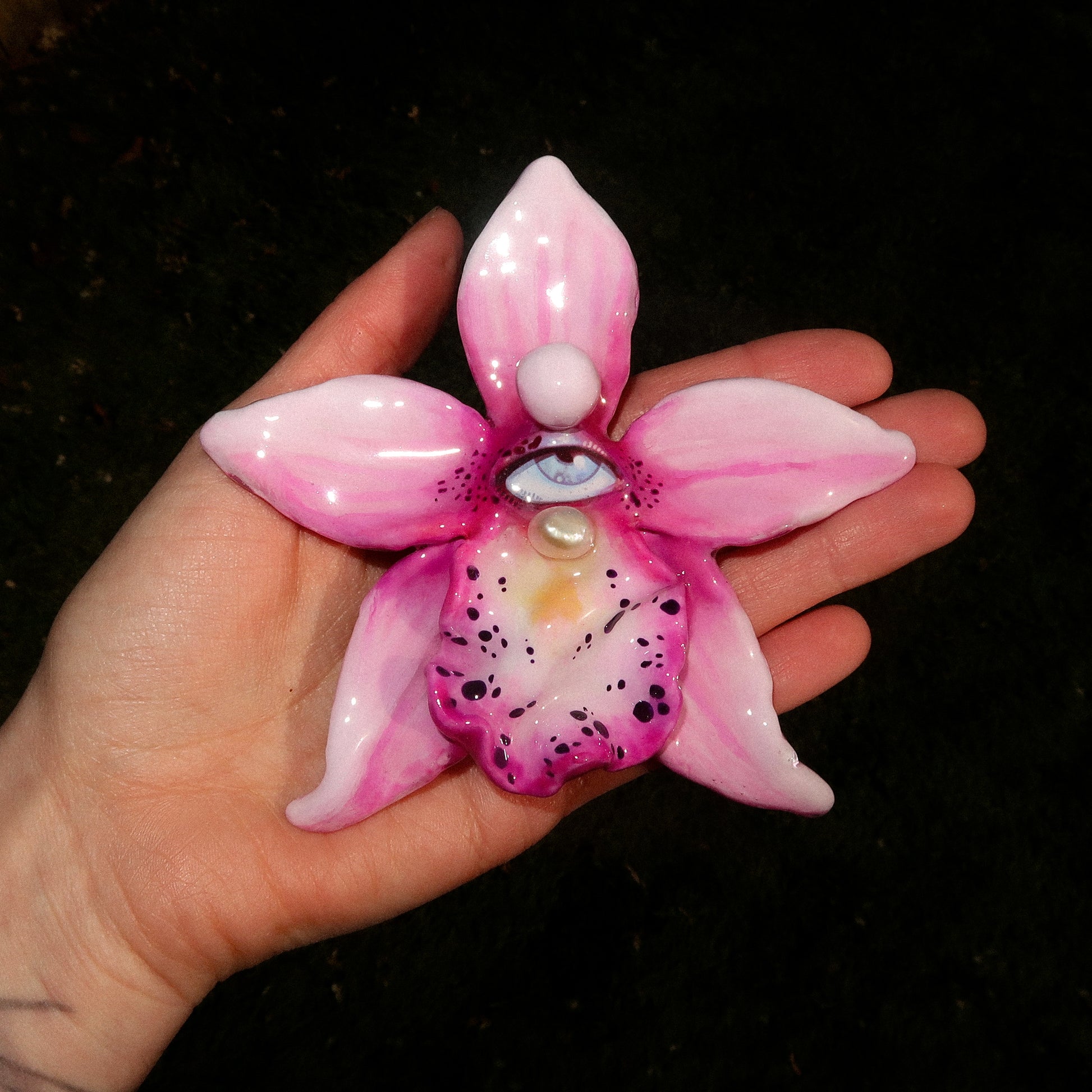 Each orchid is sculpted by hand from clay and painted layer by layer to capture its natural detail. The center of every flower holds my signature eye charm, a symbol of protection, and some designs are adorned with glass and pearls to enhance their earthy, organic look. Every piece is finished with resin for a smooth, glossy shine.