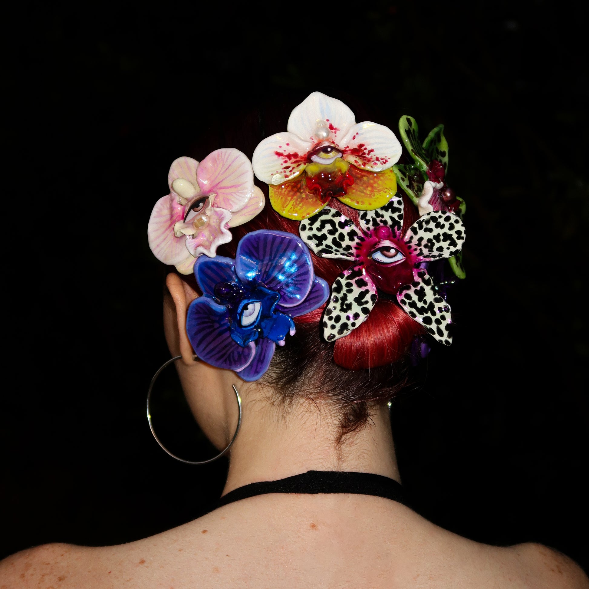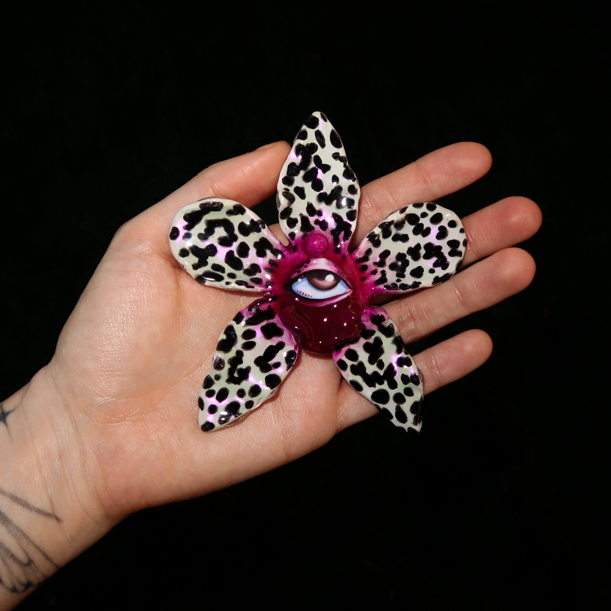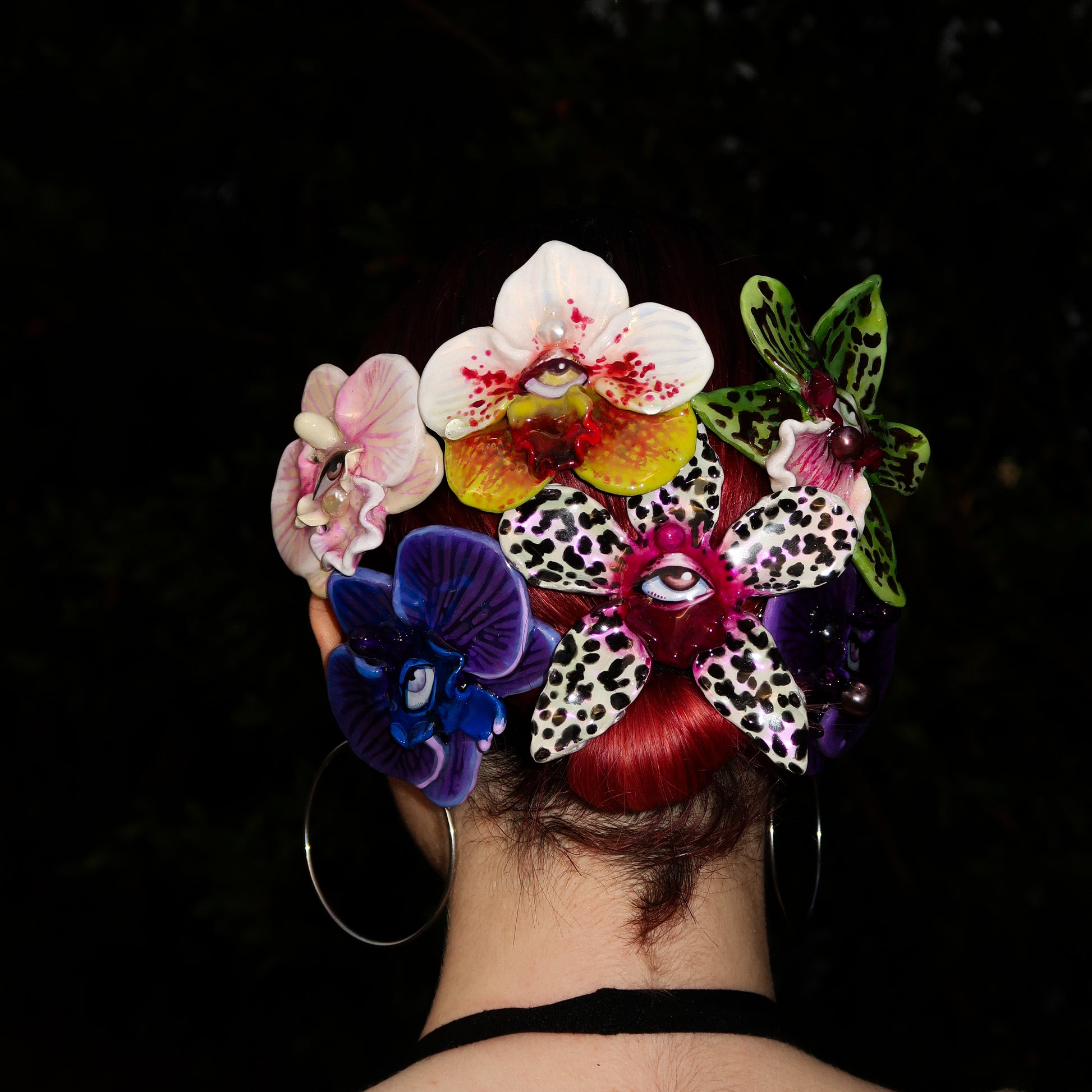 Each orchid is sculpted by hand from clay and painted layer by layer to capture its natural detail. The center of every flower holds my signature eye charm, a symbol of protection, and some designs are adorned with glass and pearls to enhance their earthy, organic look. Every piece is finished with resin for a smooth, glossy shine.