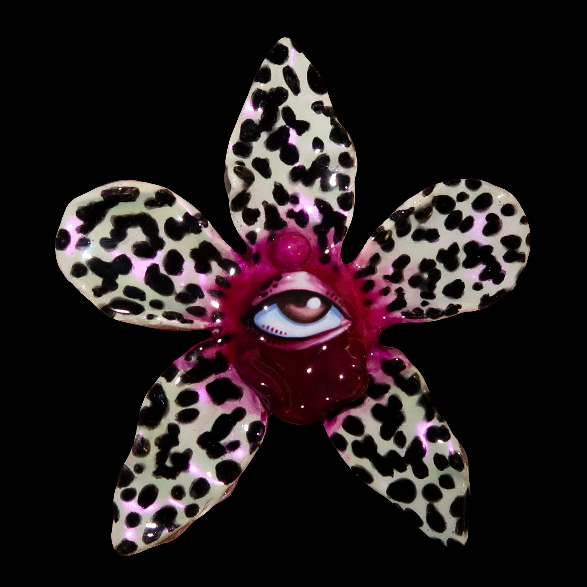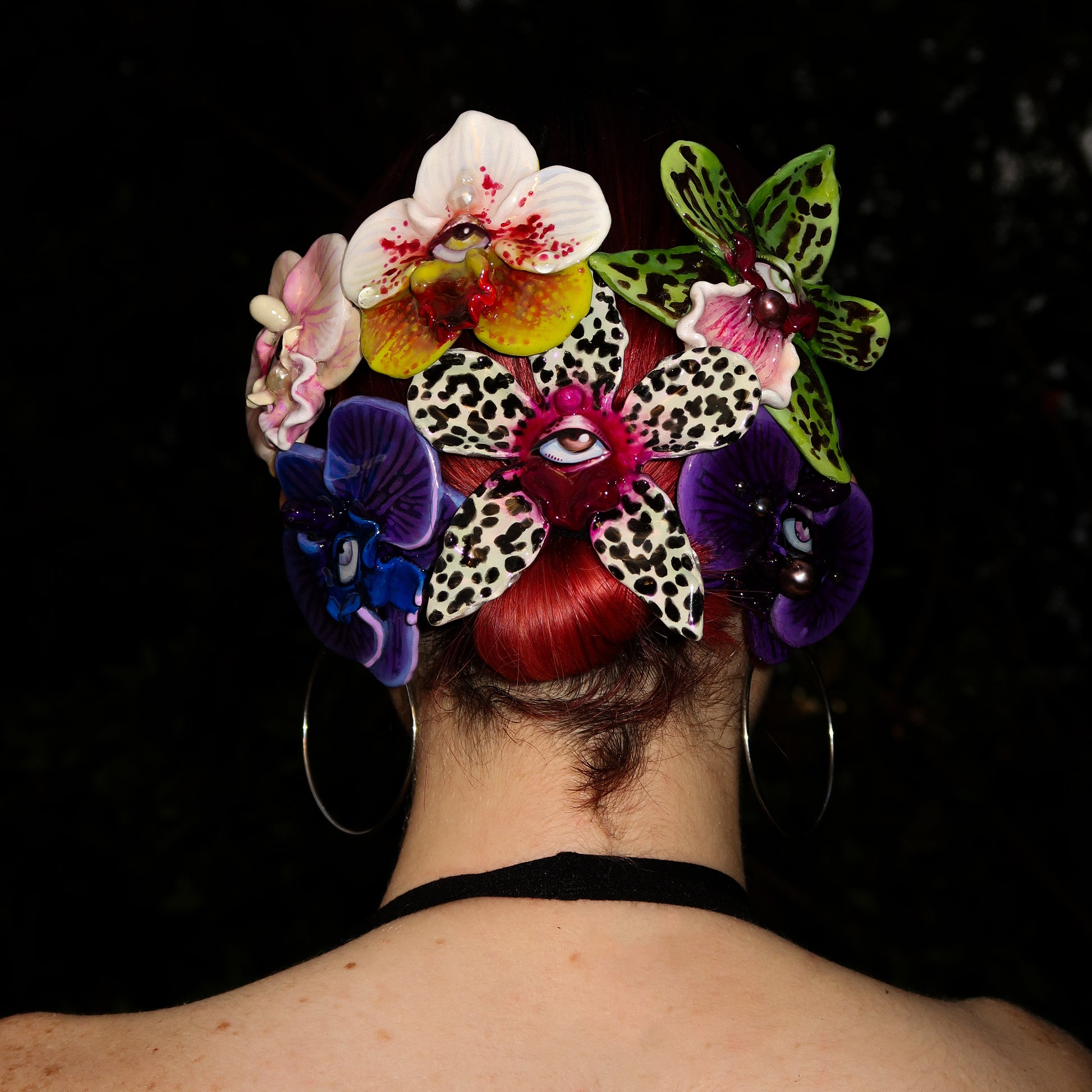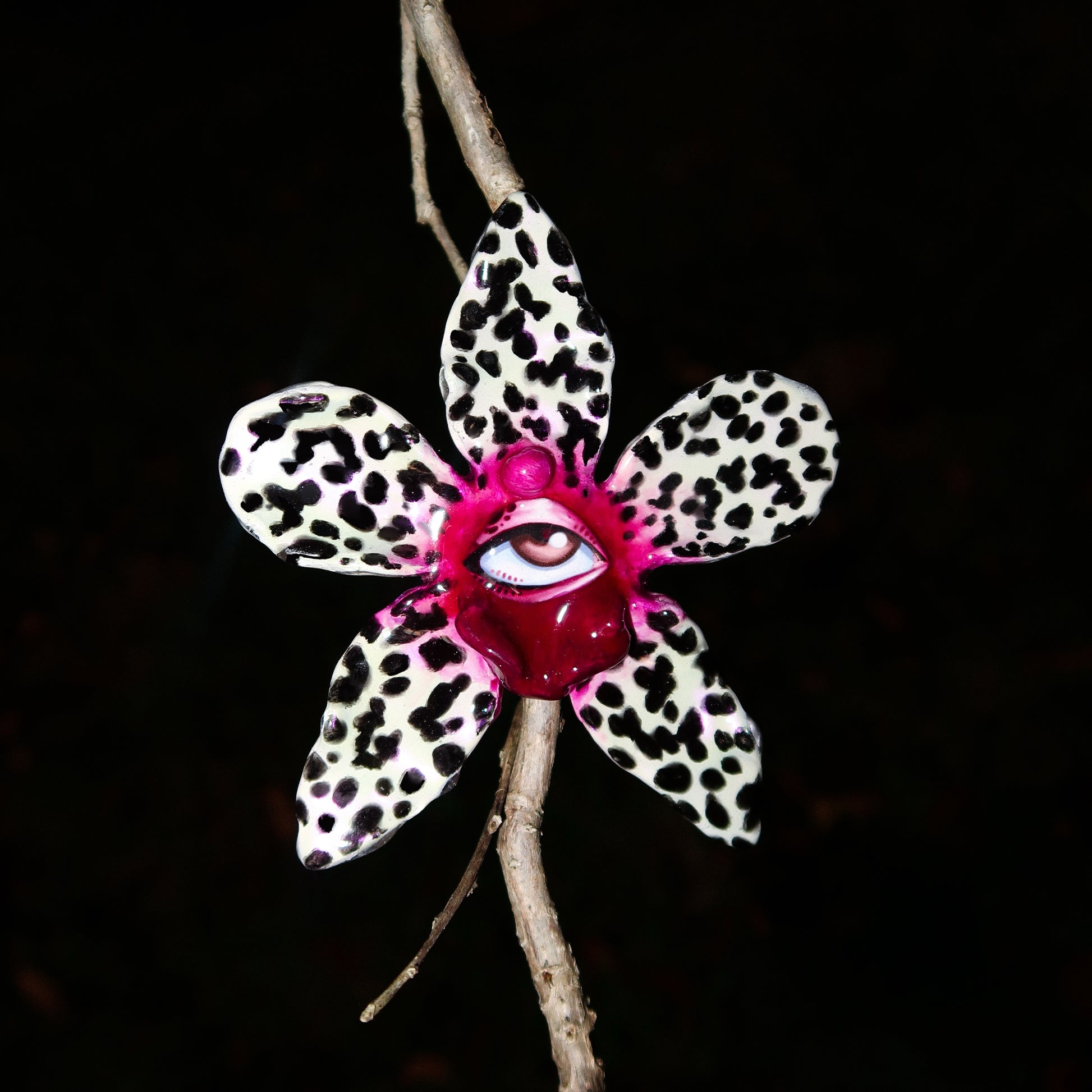 Each orchid is sculpted by hand from clay and painted layer by layer to capture its natural detail. The center of every flower holds my signature eye charm, a symbol of protection, and some designs are adorned with glass and pearls to enhance their earthy, organic look. Every piece is finished with resin for a smooth, glossy shine.