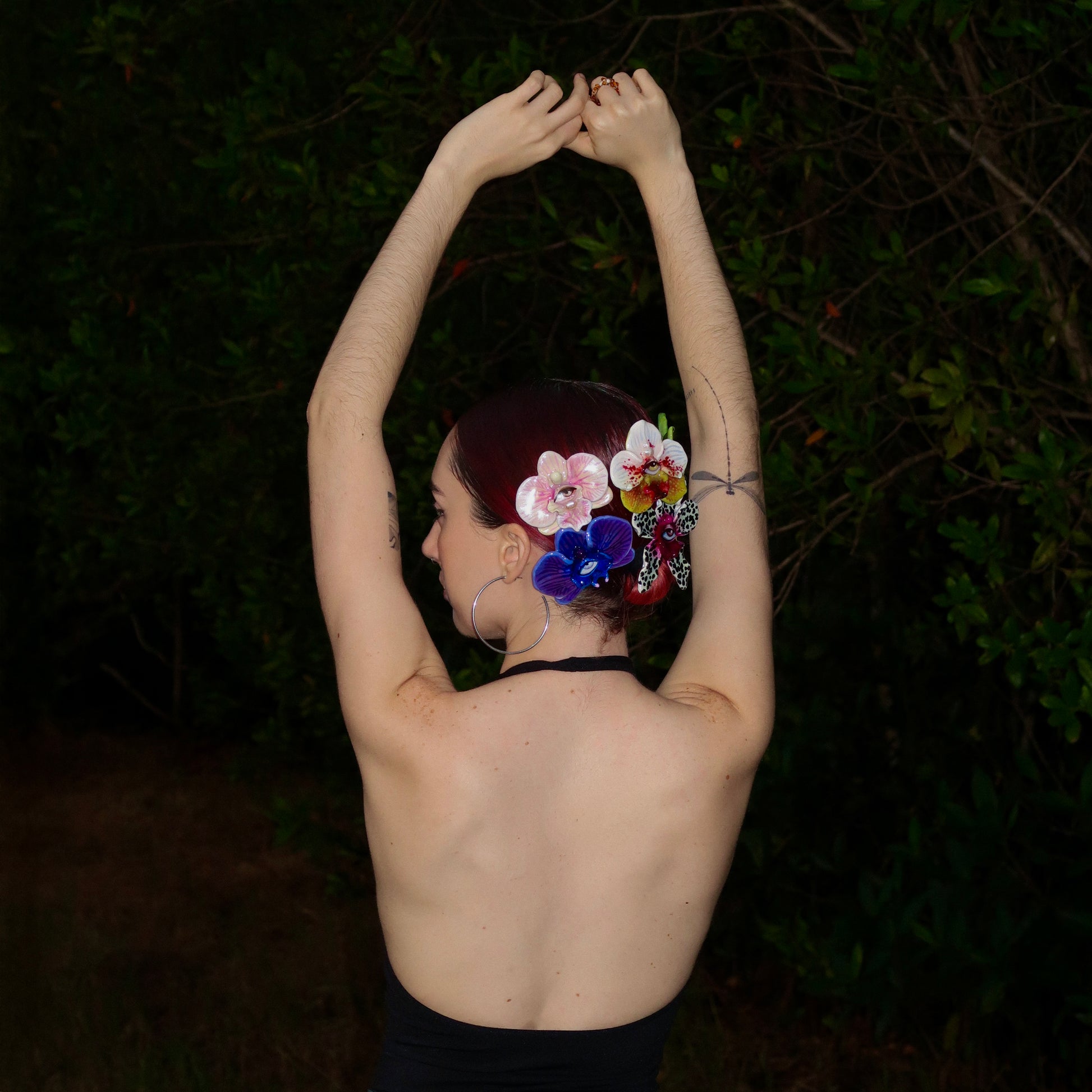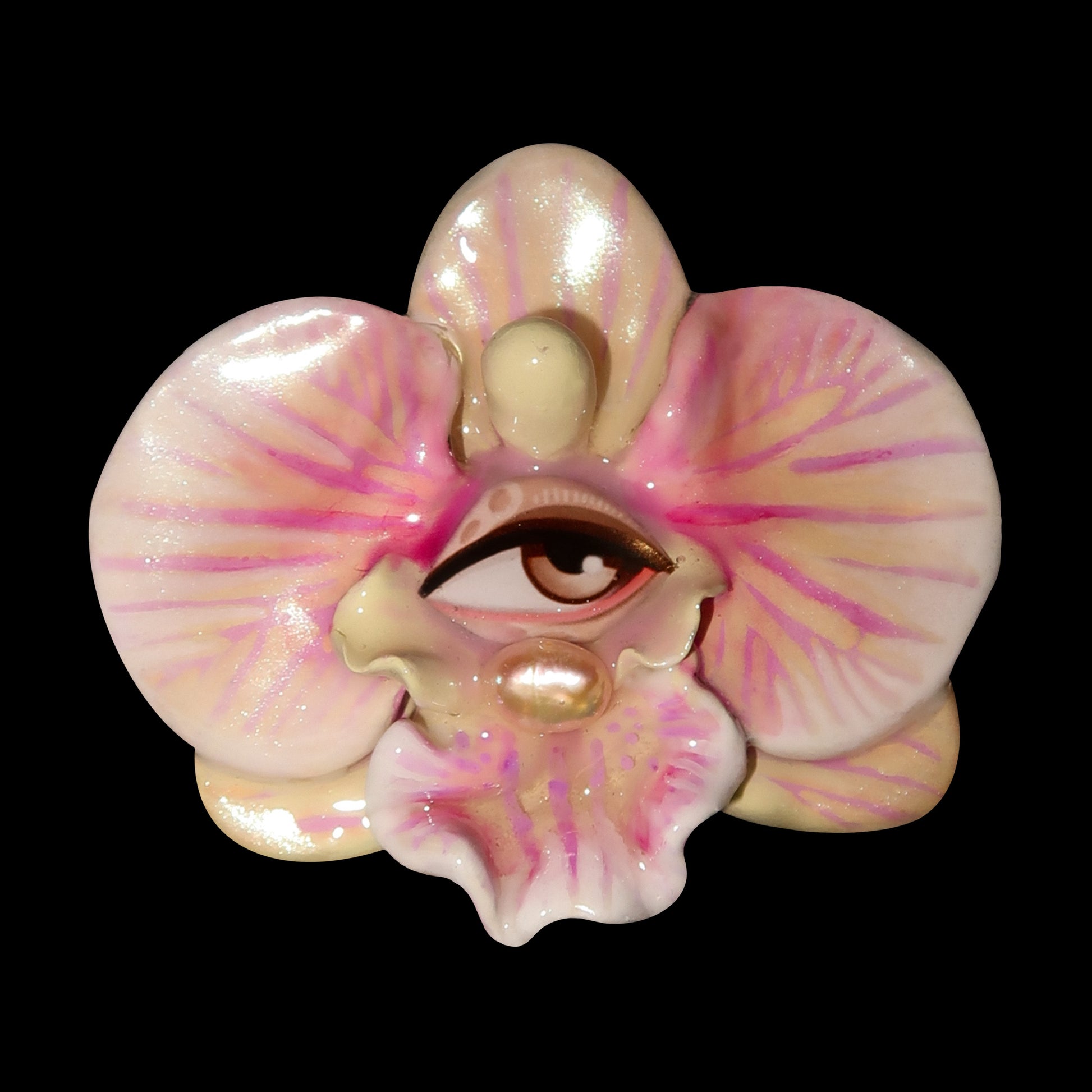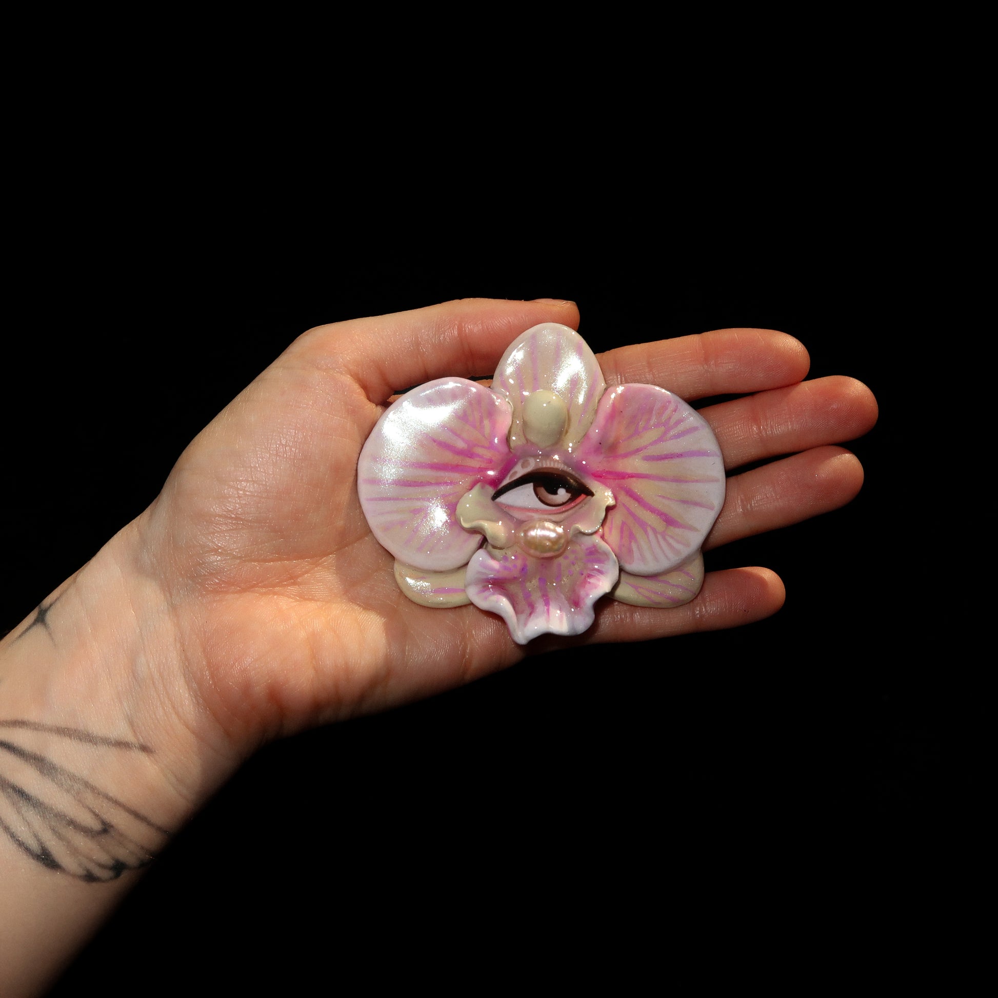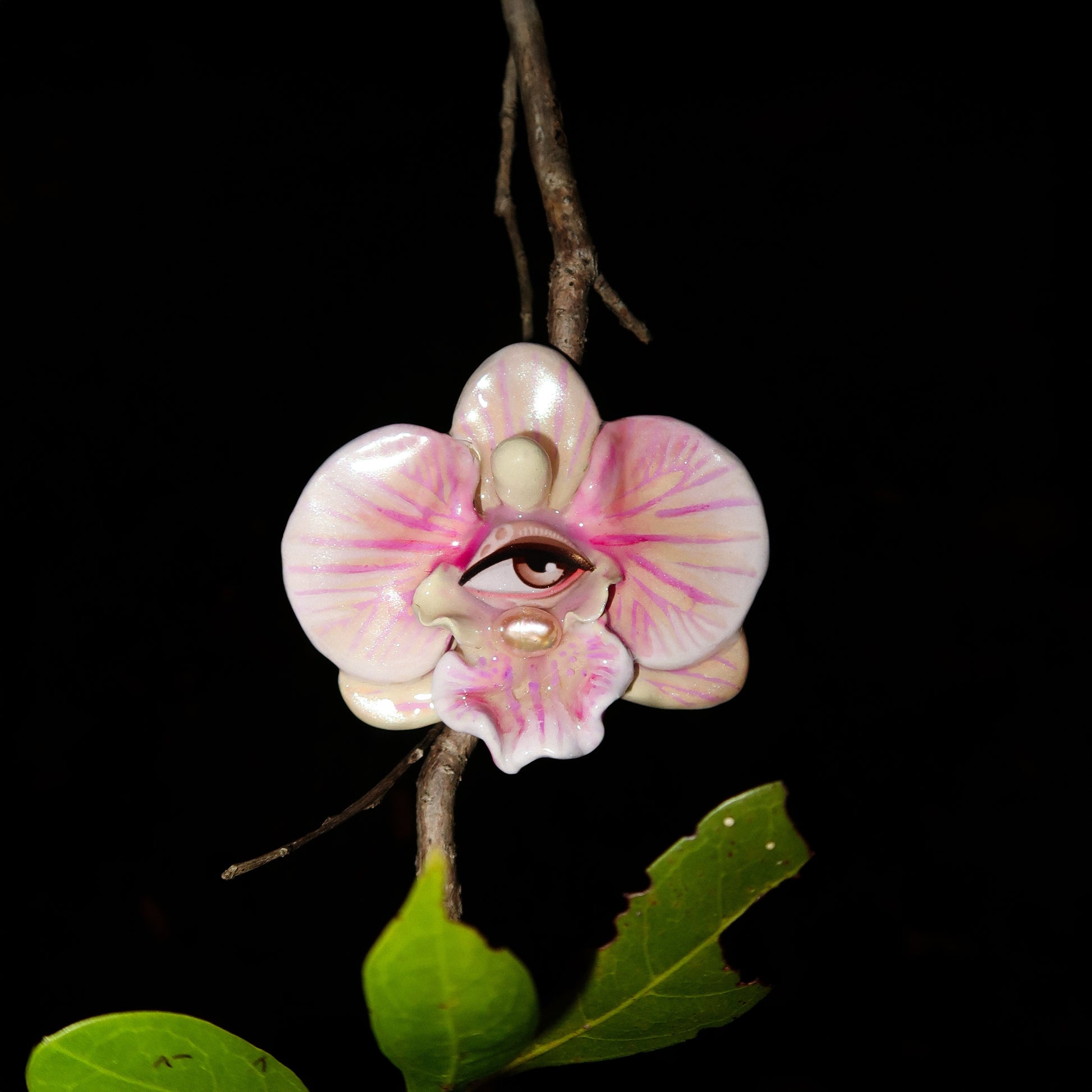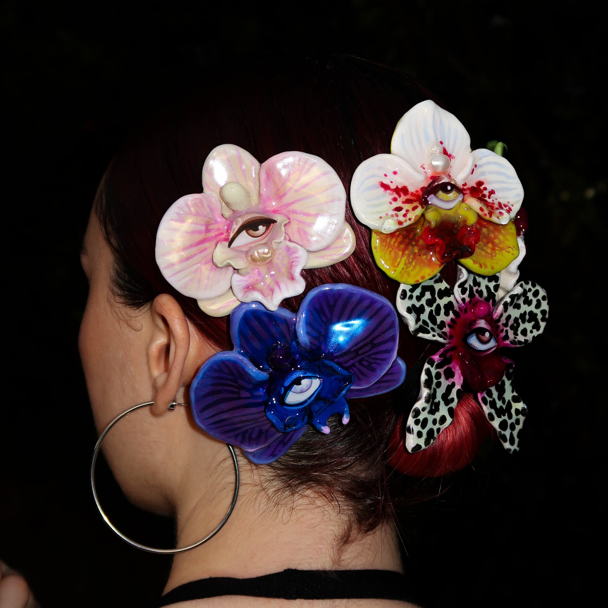 Each orchid is sculpted by hand from clay and painted layer by layer to capture its natural detail. The center of every flower holds my signature eye charm, a symbol of protection, and some designs are adorned with glass and pearls to enhance their earthy, organic look. Every piece is finished with resin for a smooth, glossy shine.