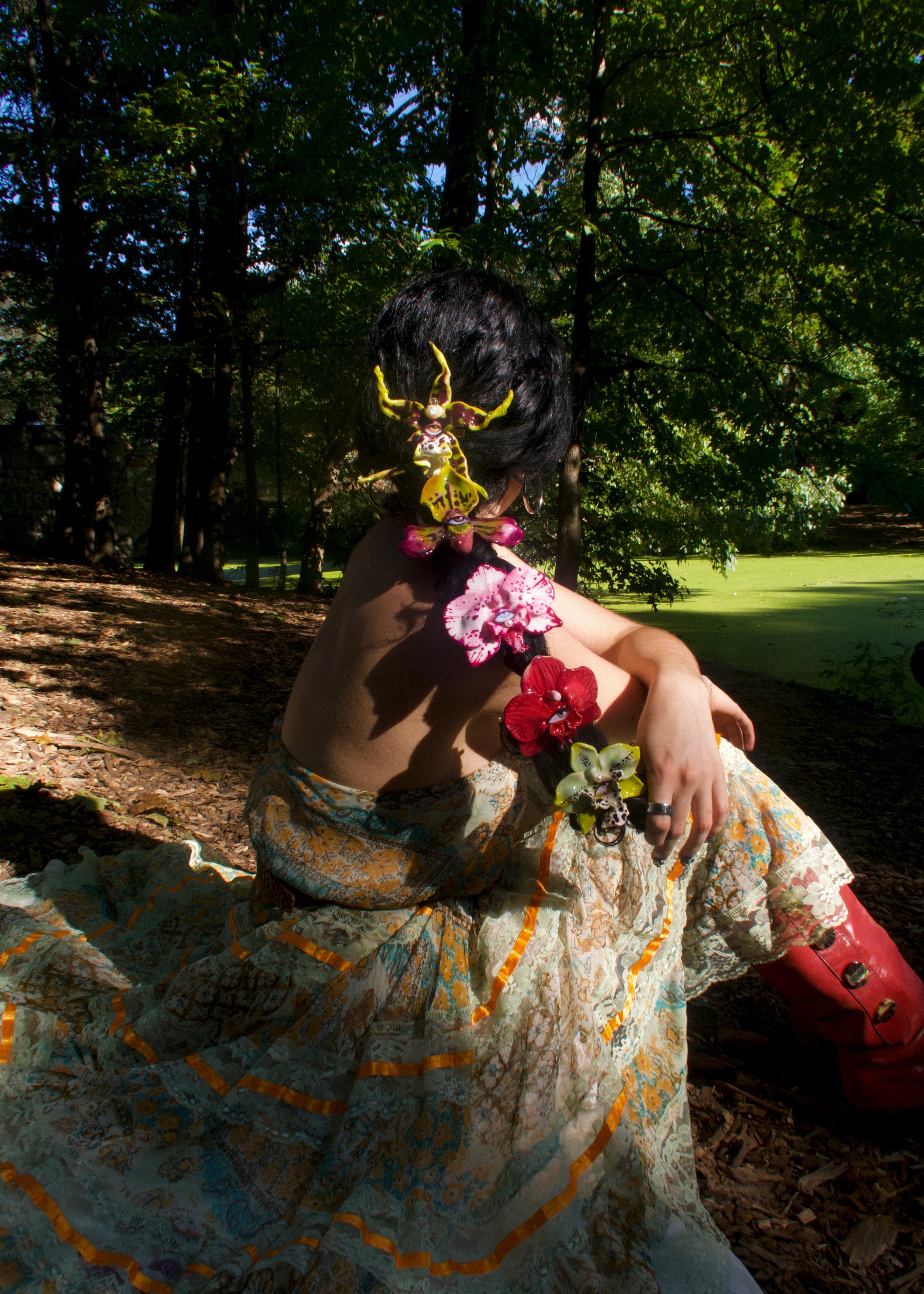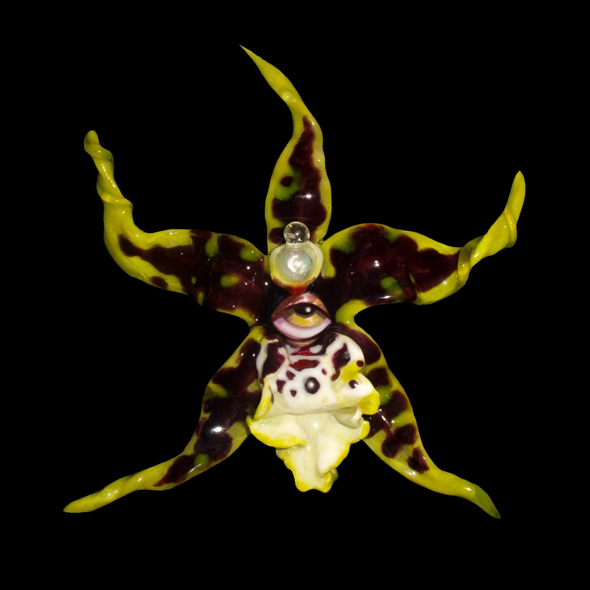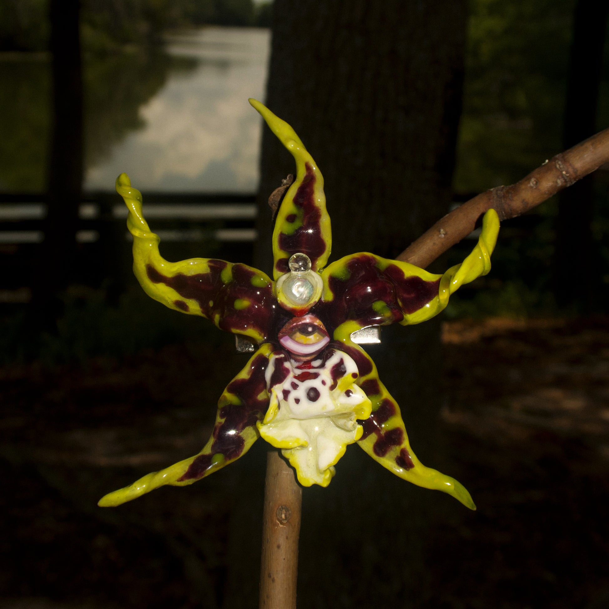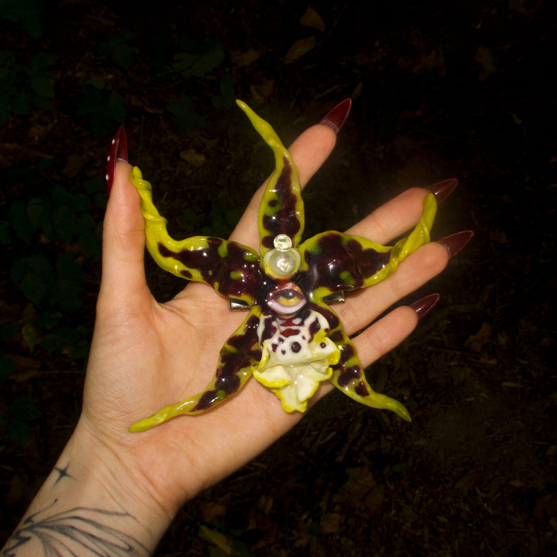 Each orchid is sculpted by hand from clay and painted layer by layer to capture its natural detail. The center of every flower holds my signature eye charm, a symbol of protection, and some designs are adorned with glass and pearls to enhance their earthy, organic look. Every piece is finished with resin for a smooth, glossy shine.