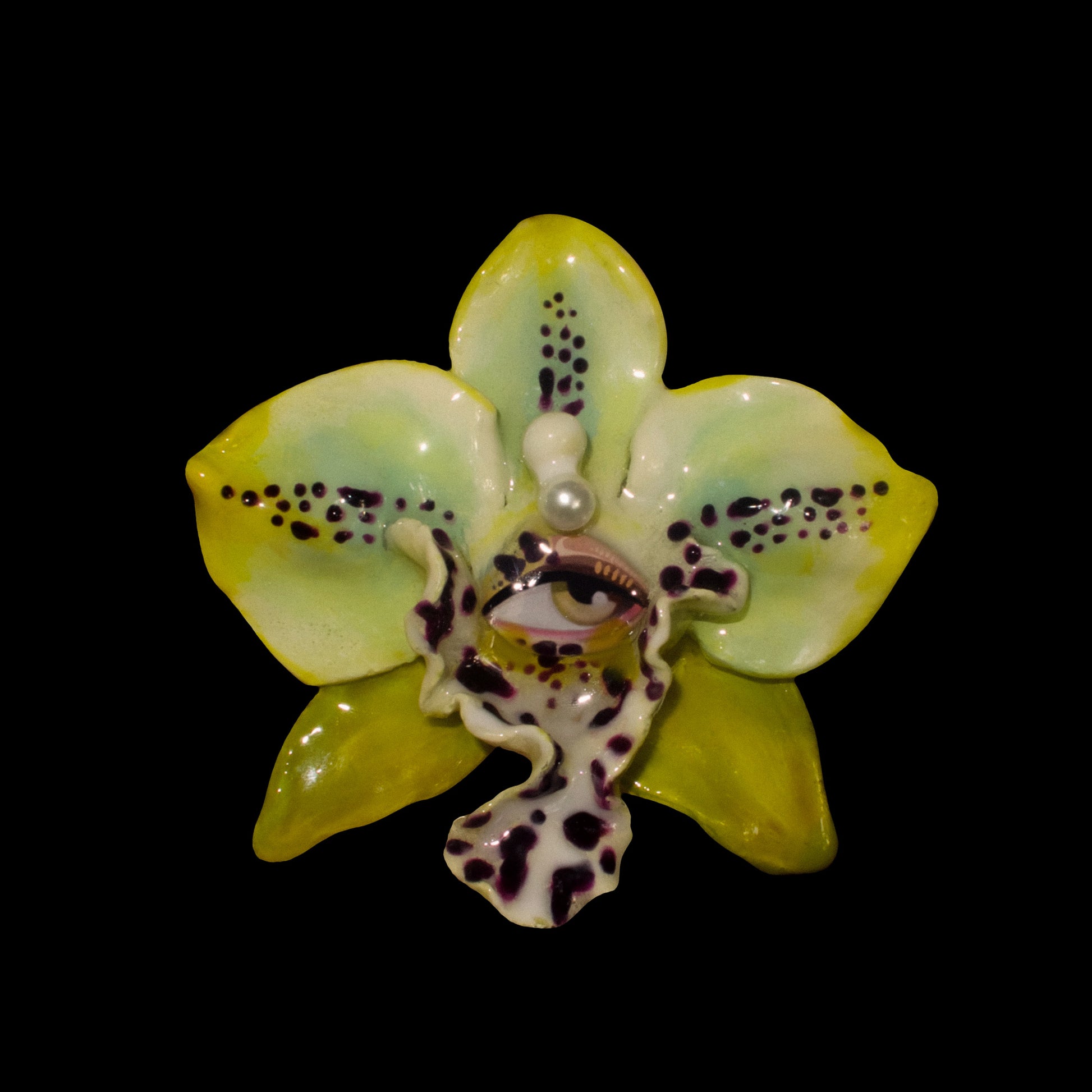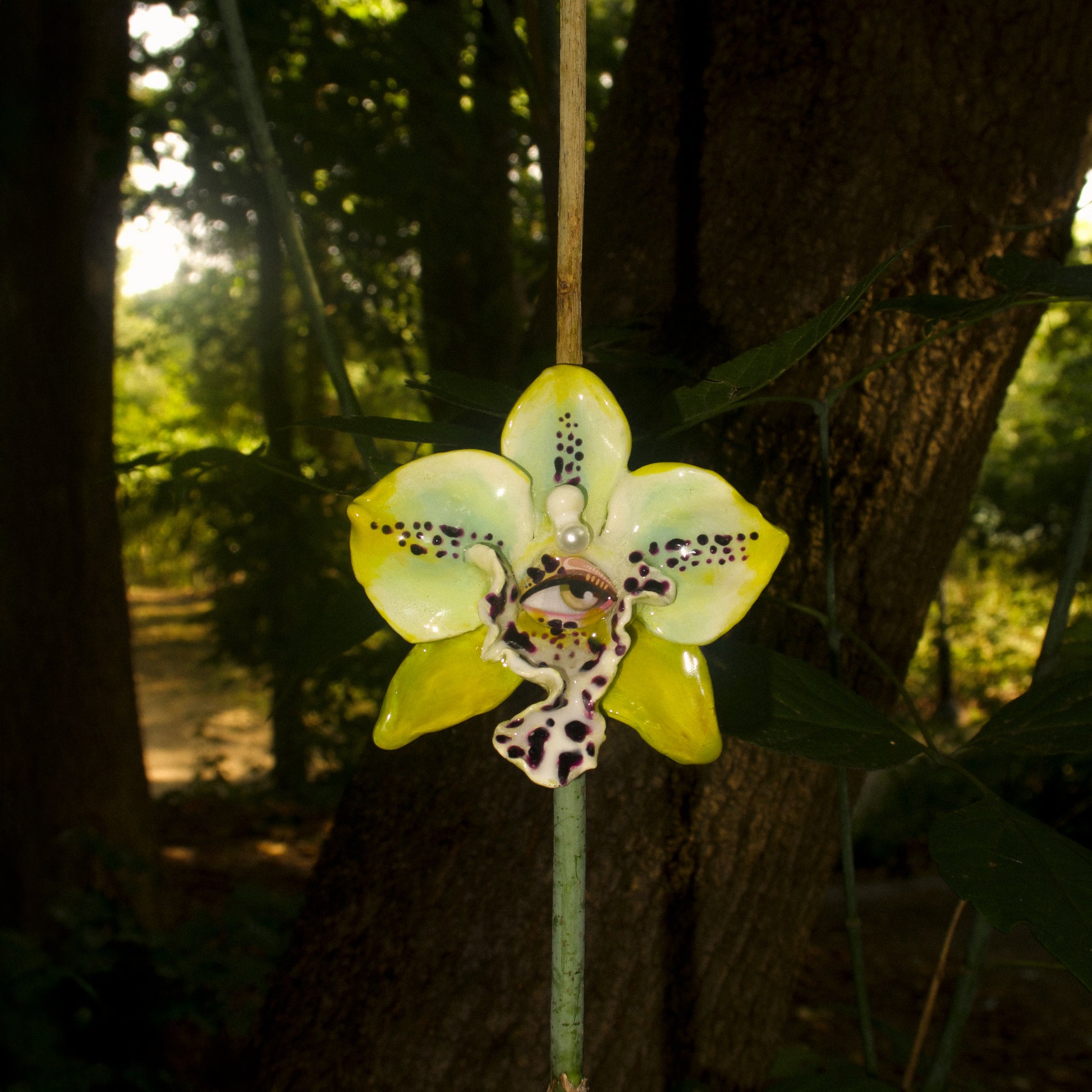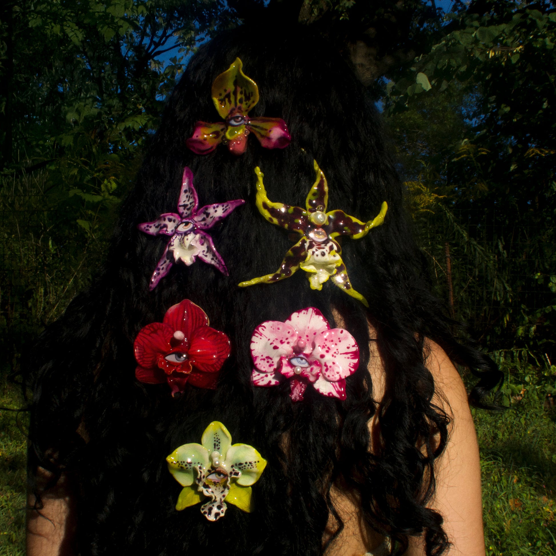 Each orchid is sculpted by hand from clay and painted layer by layer to capture its natural detail. The center of every flower holds my signature eye charm, a symbol of protection, and some designs are adorned with glass and pearls to enhance their earthy, organic look. Every piece is finished with resin for a smooth, glossy shine.