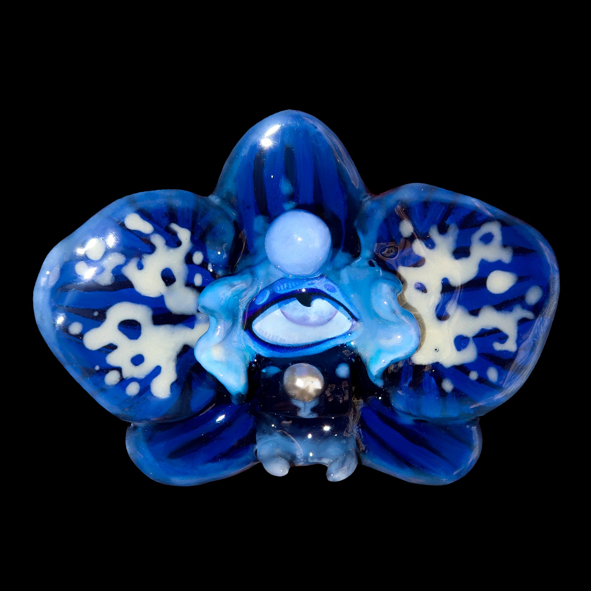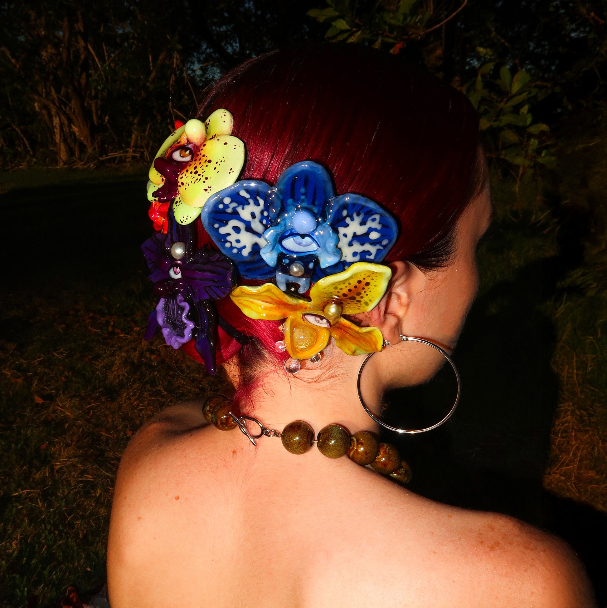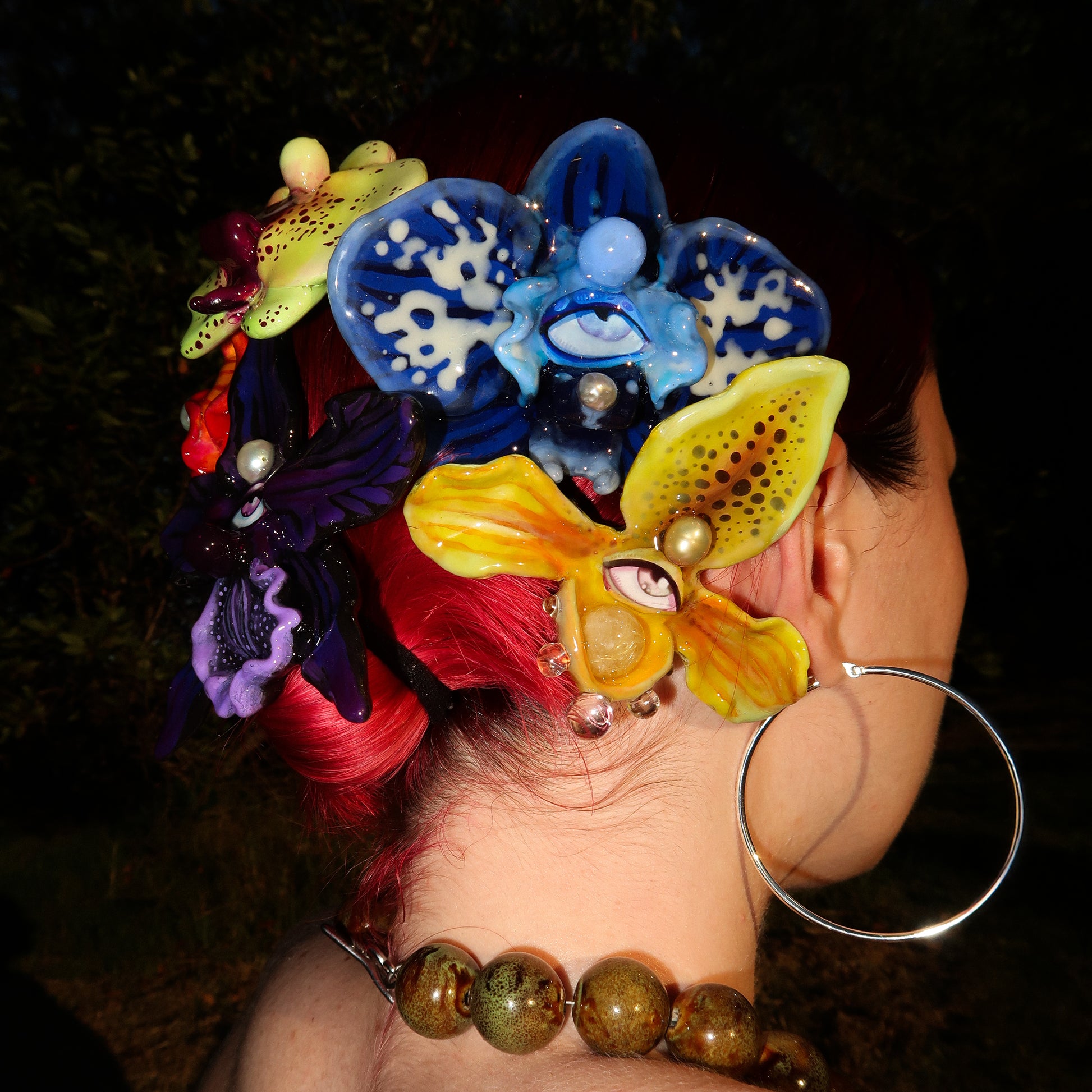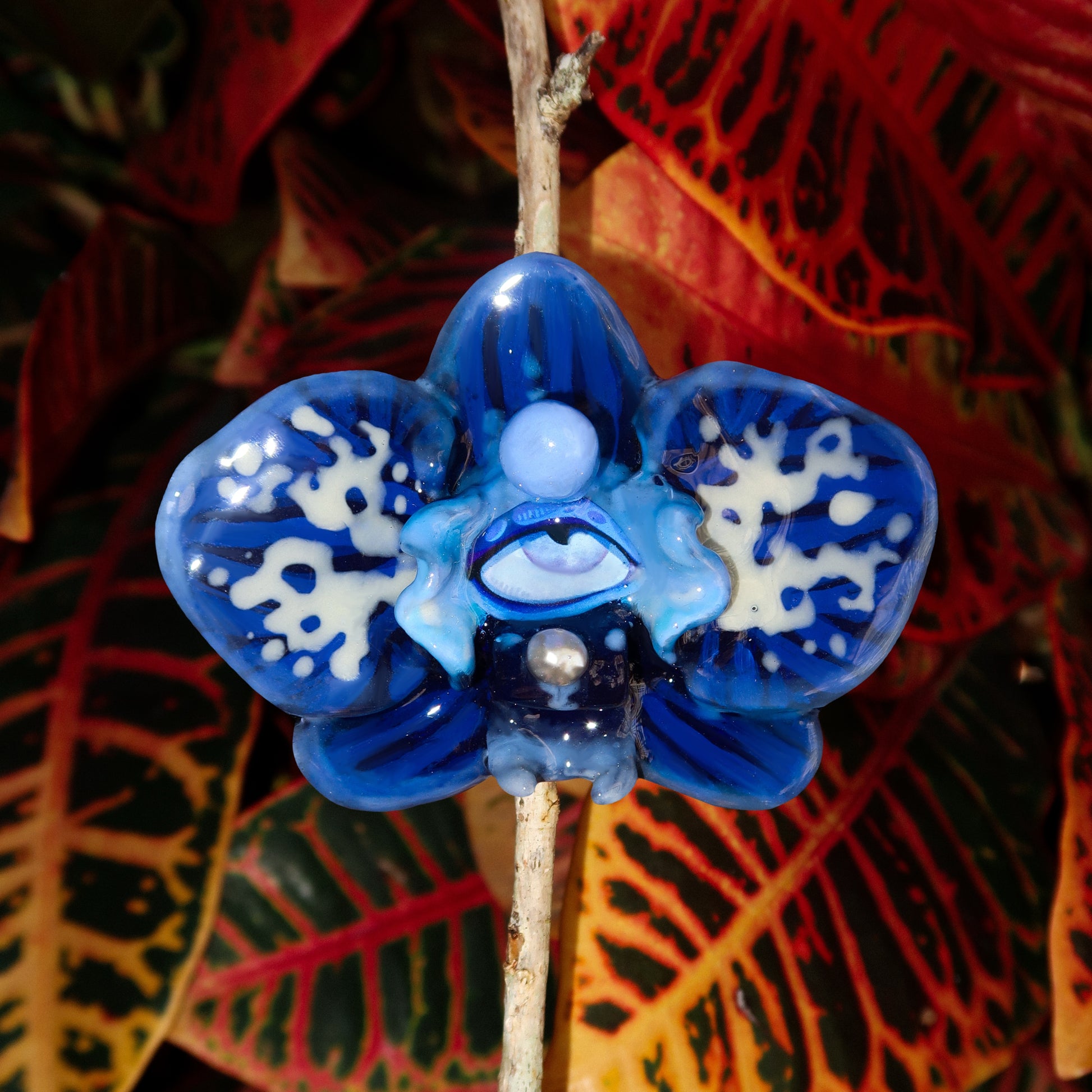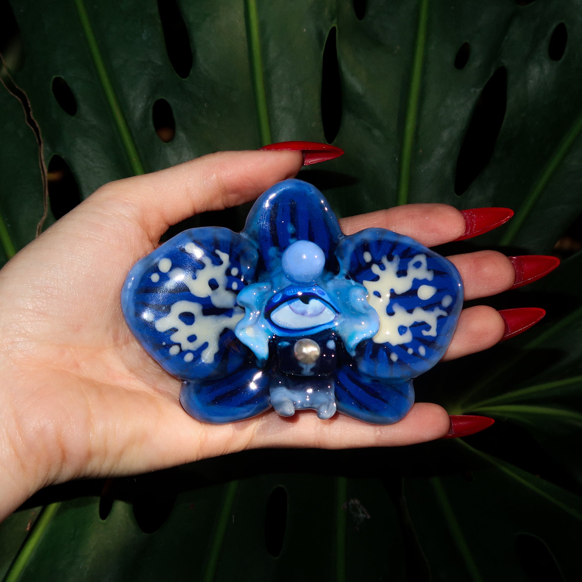 Each orchid is sculpted by hand from clay and painted layer by layer to capture its natural detail. The center of every flower holds my signature eye charm, a symbol of protection, and some designs are adorned with glass and pearls to enhance their earthy, organic look. Every piece is finished with resin for a smooth, glossy shine.