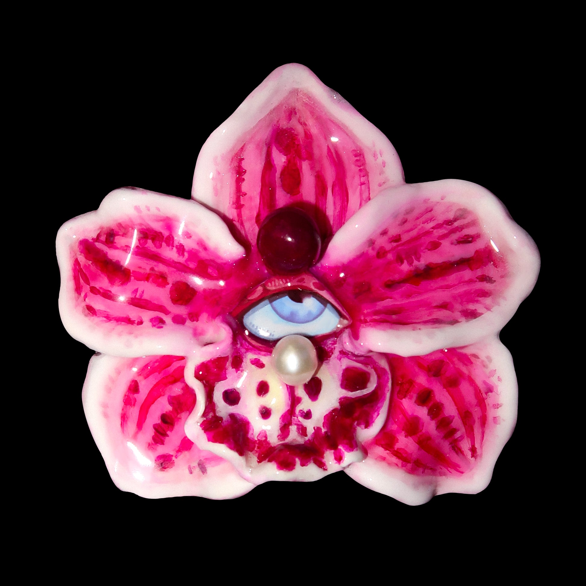 Each orchid is sculpted by hand from clay and painted layer by layer to capture its natural detail. The center of every flower holds my signature eye charm, a symbol of protection, and some designs are adorned with glass and pearls to enhance their earthy, organic look. Every piece is finished with resin for a smooth, glossy shine.