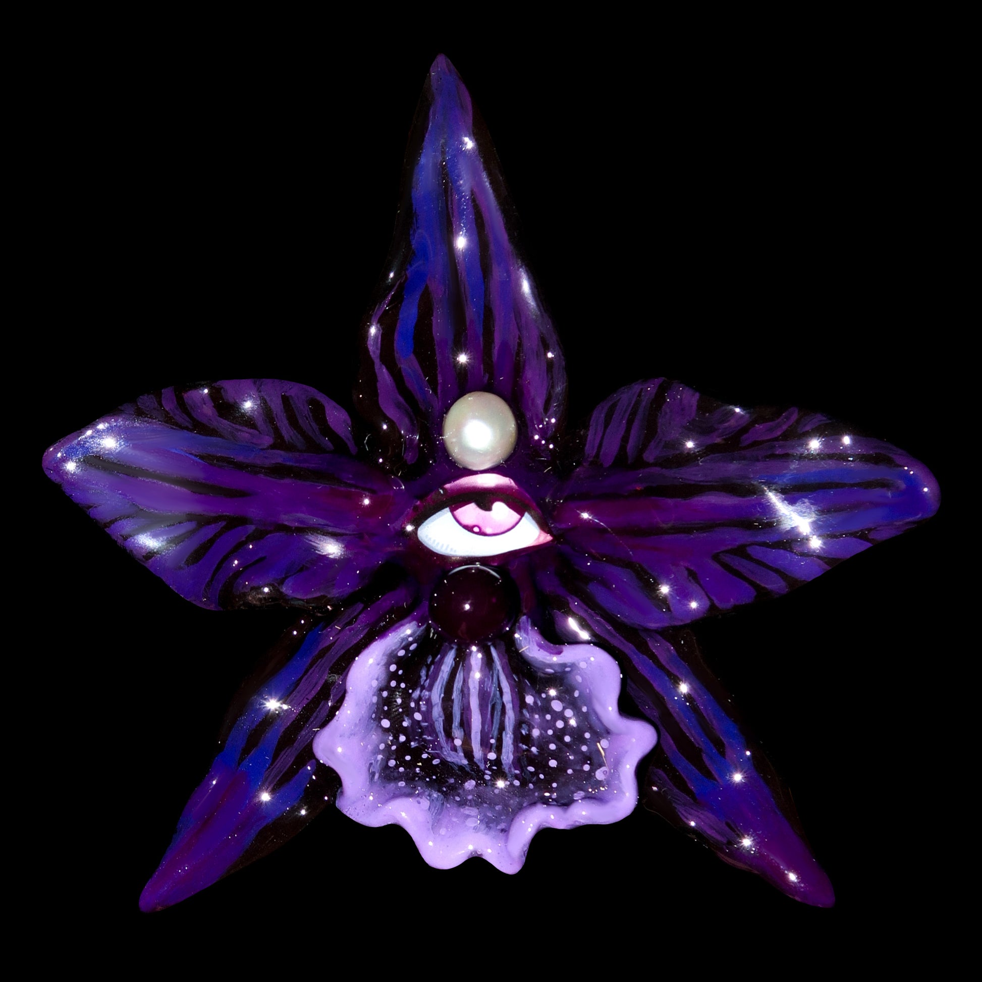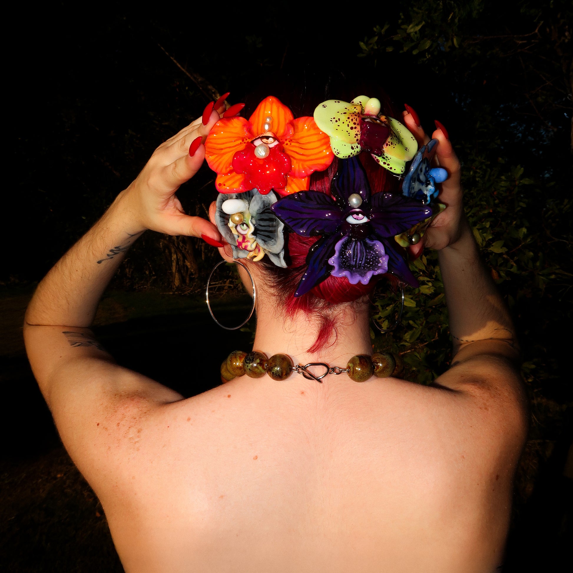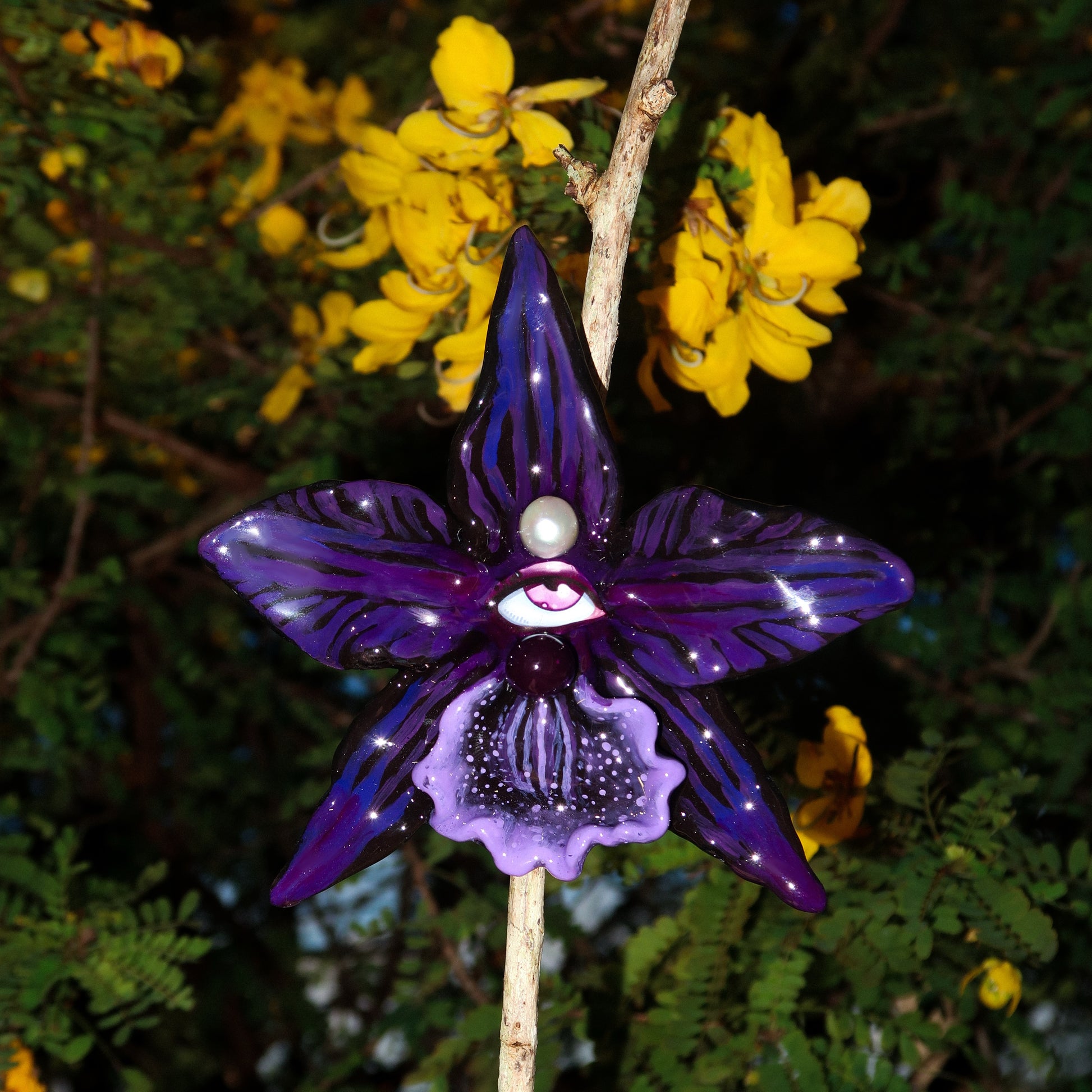 Each orchid is sculpted by hand from clay and painted layer by layer to capture its natural detail. The center of every flower holds my signature eye charm, a symbol of protection, and some designs are adorned with glass and pearls to enhance their earthy, organic look. Every piece is finished with resin for a smooth, glossy shine.