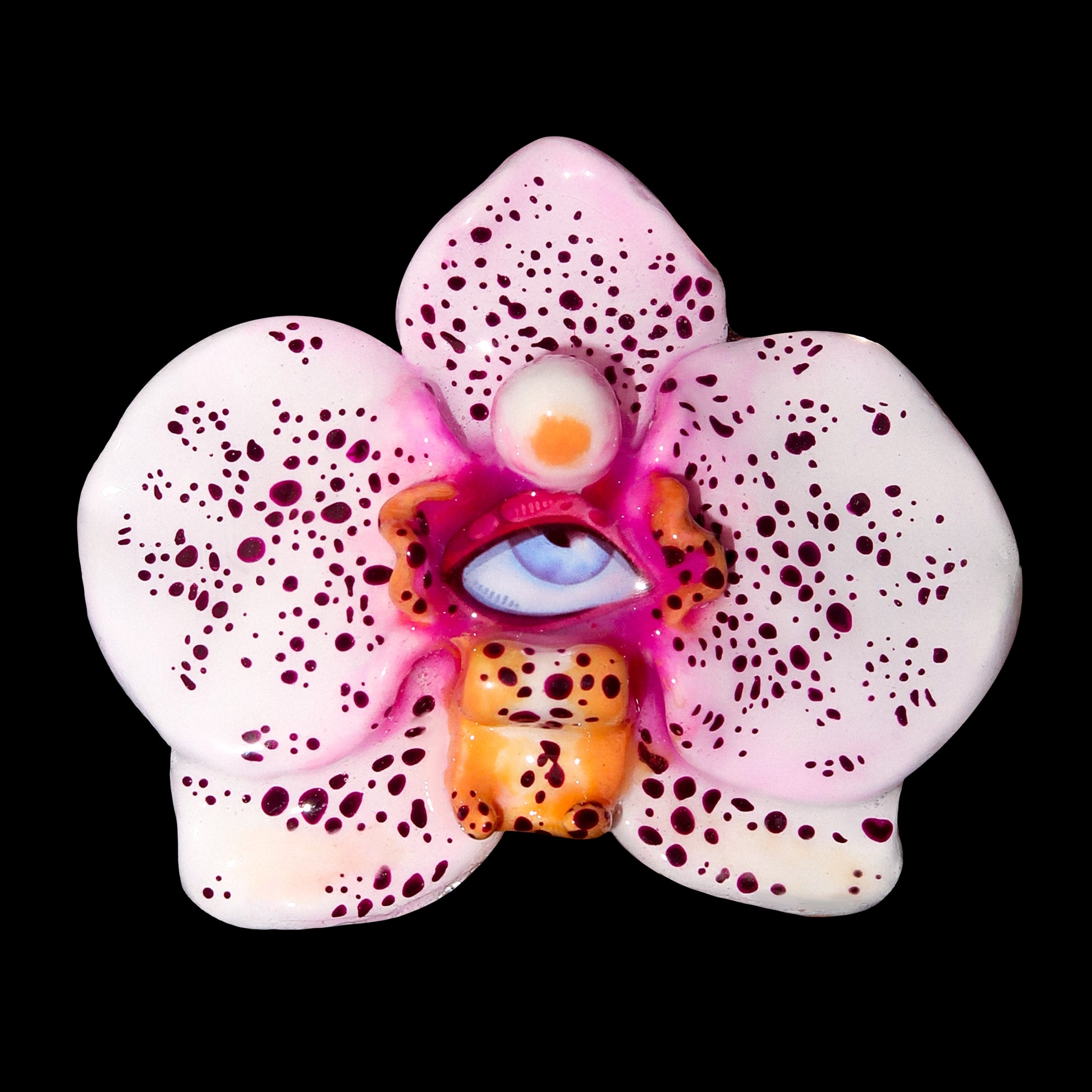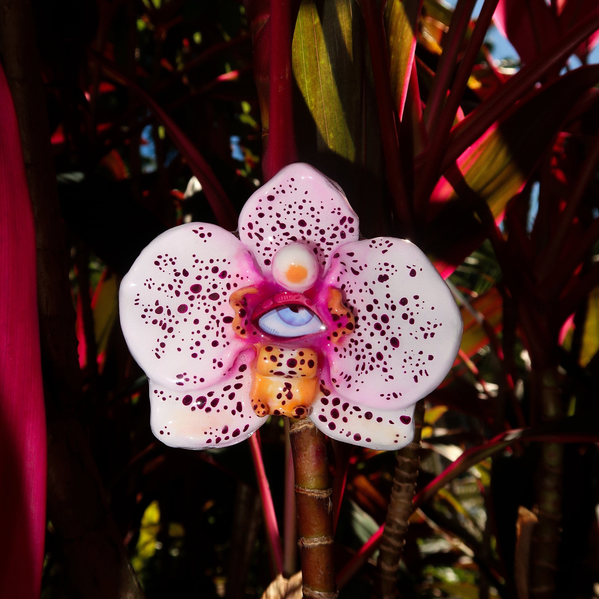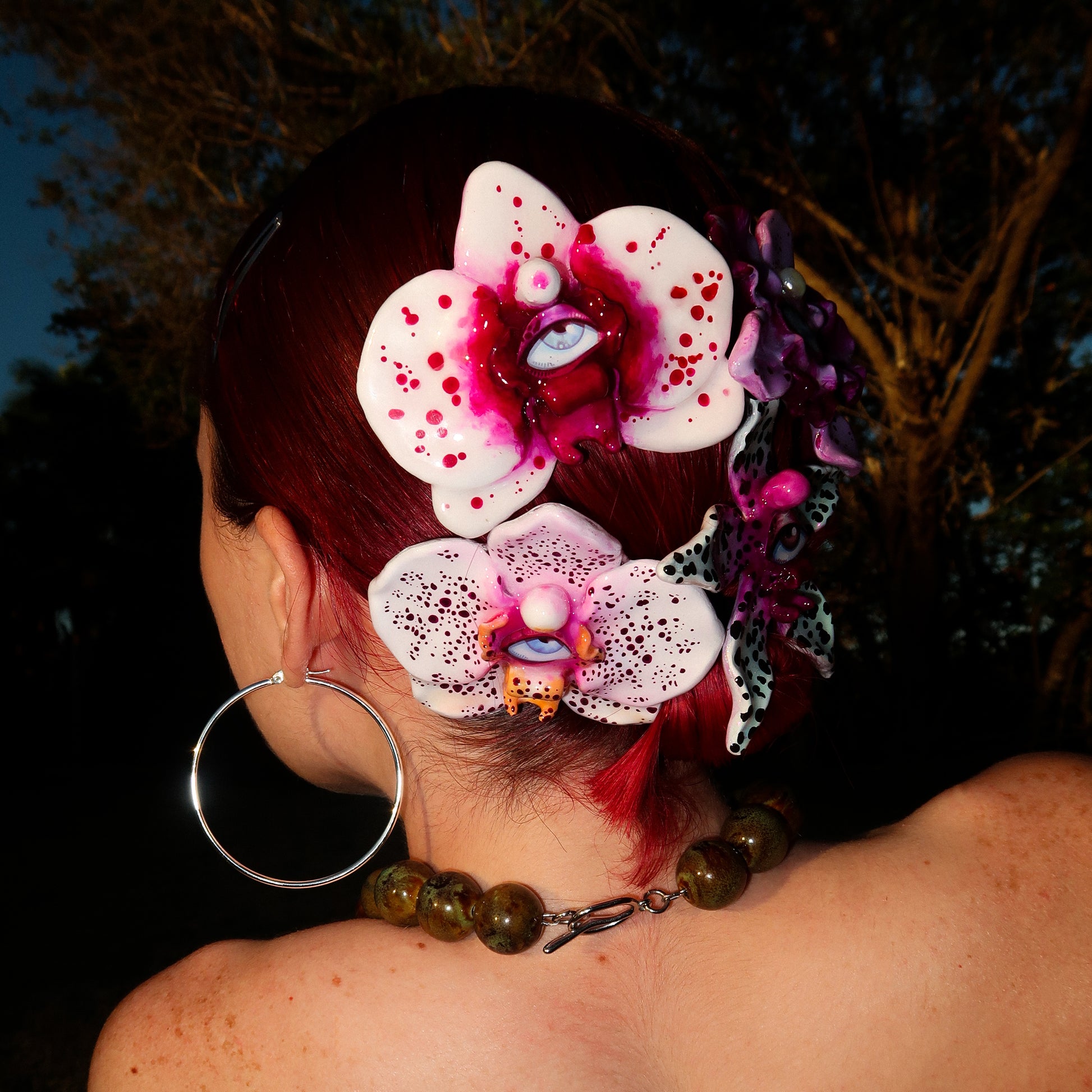 Each orchid is sculpted by hand from clay and painted layer by layer to capture its natural detail. The center of every flower holds my signature eye charm, a symbol of protection, and some designs are adorned with glass and pearls to enhance their earthy, organic look. Every piece is finished with resin for a smooth, glossy shine.
