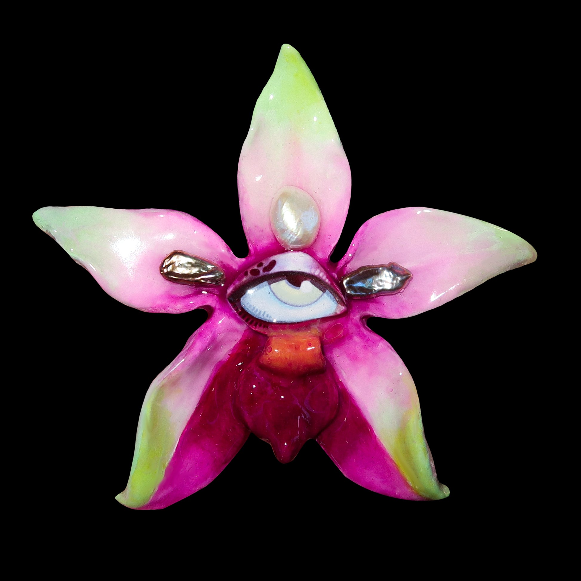 Each orchid is sculpted by hand from clay and painted layer by layer to capture its natural detail. The center of every flower holds my signature eye charm, a symbol of protection, and some designs are adorned with glass and pearls to enhance their earthy, organic look. Every piece is finished with resin for a smooth, glossy shine.