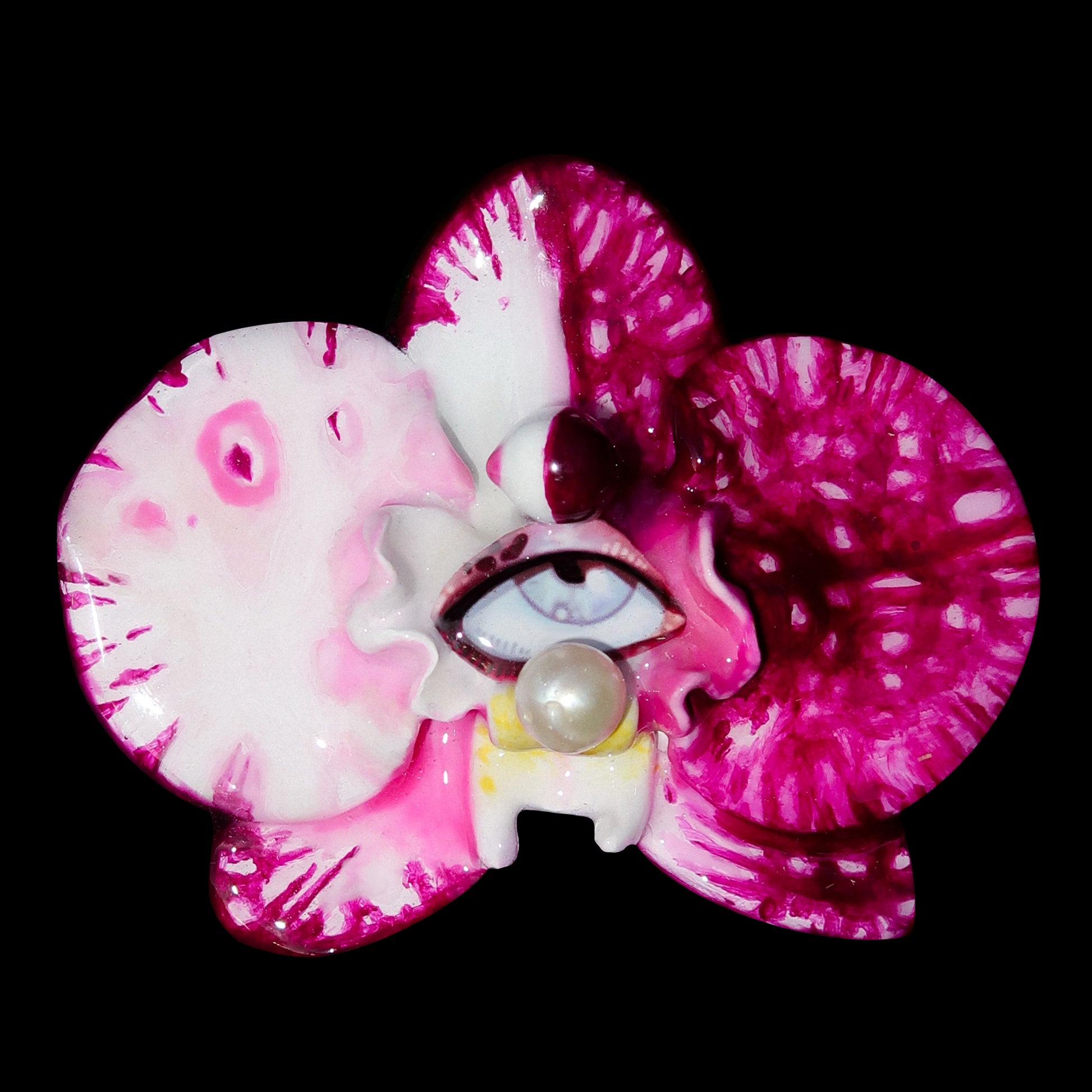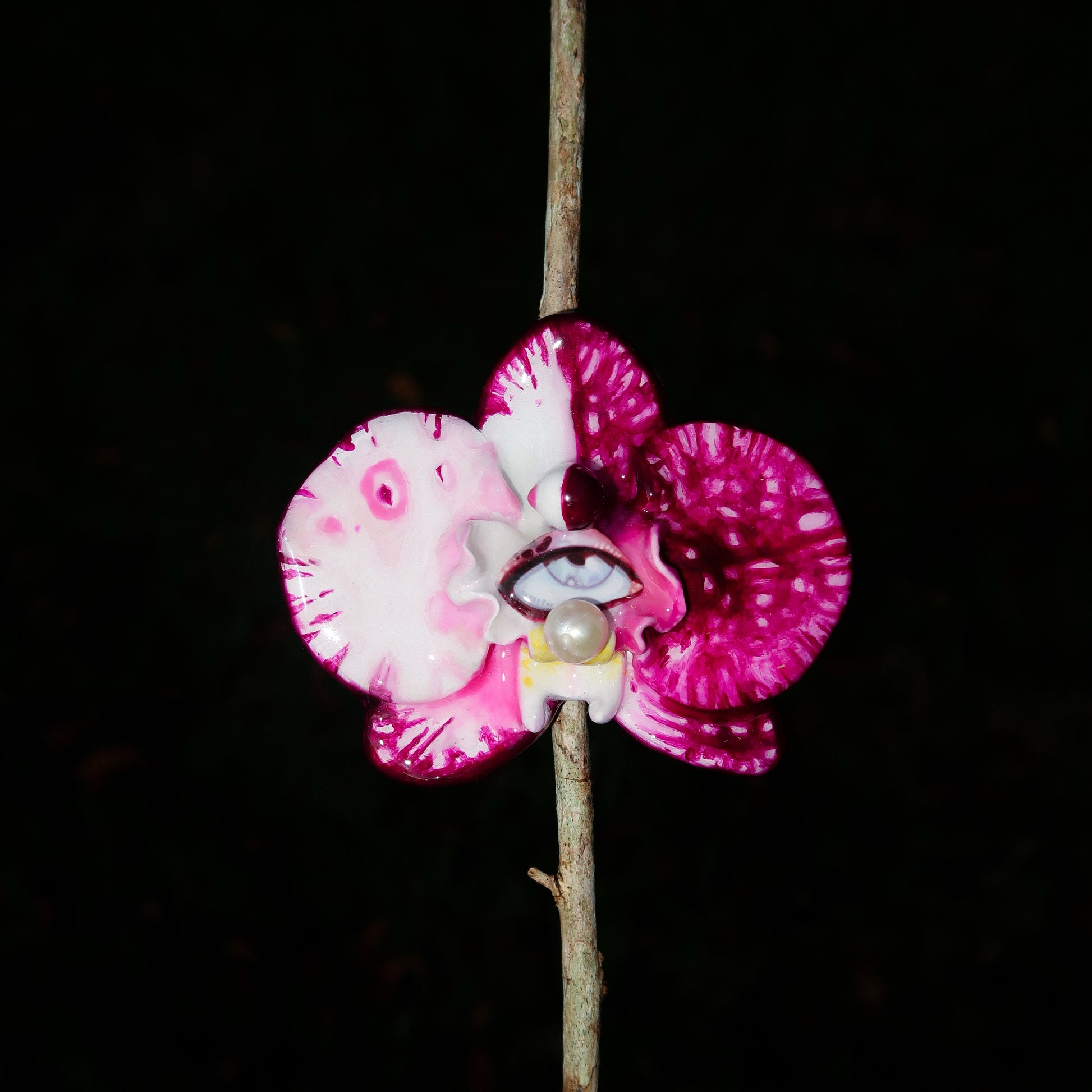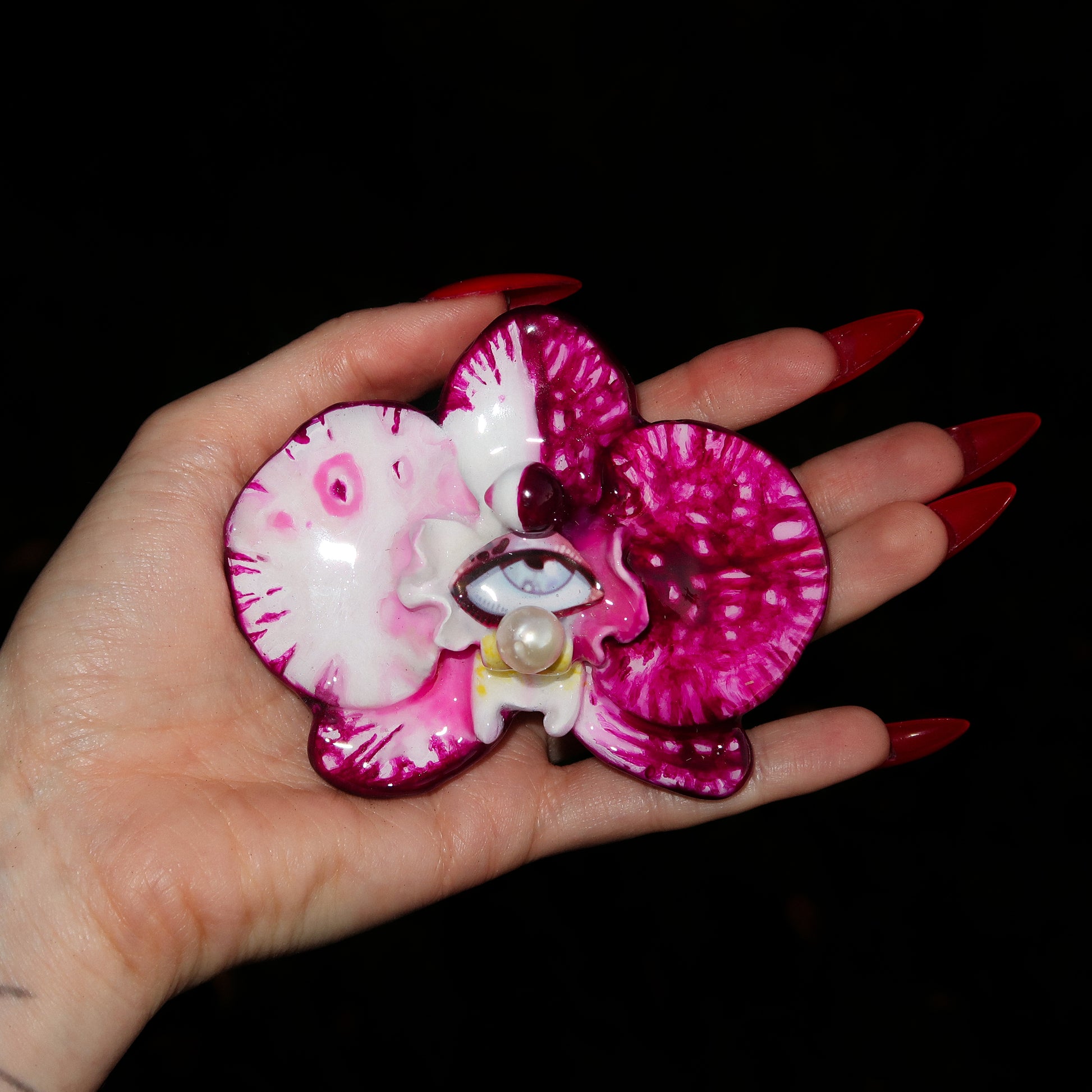 Each orchid is sculpted by hand from clay and painted layer by layer to capture its natural detail. The center of every flower holds my signature eye charm, a symbol of protection, and some designs are adorned with glass and pearls to enhance their earthy, organic look. Every piece is finished with resin for a smooth, glossy shine.