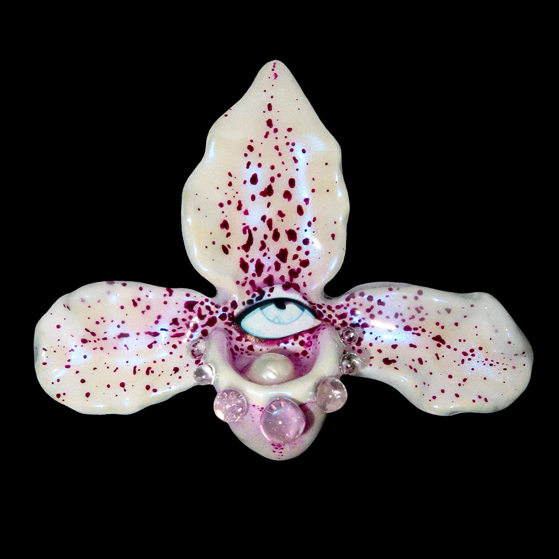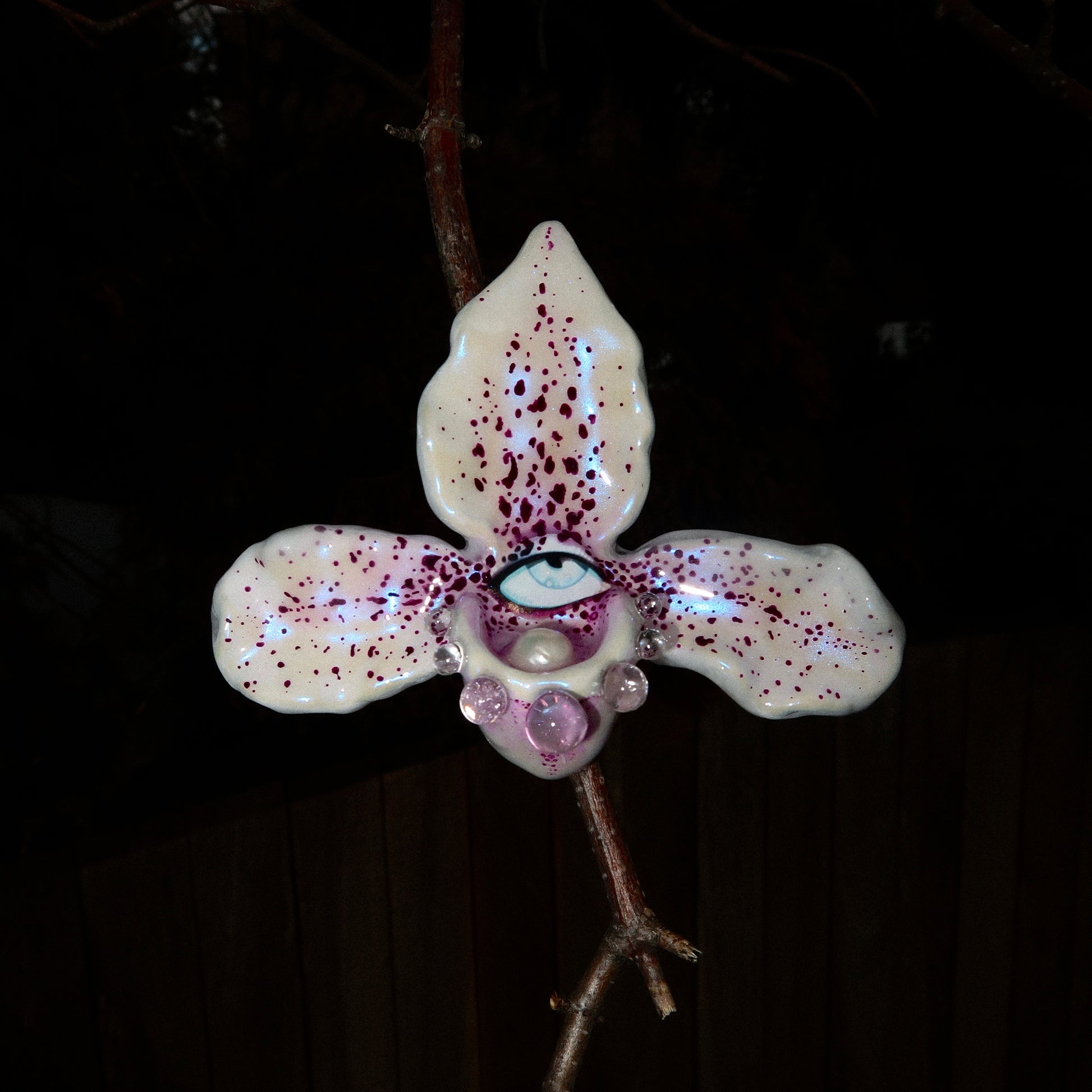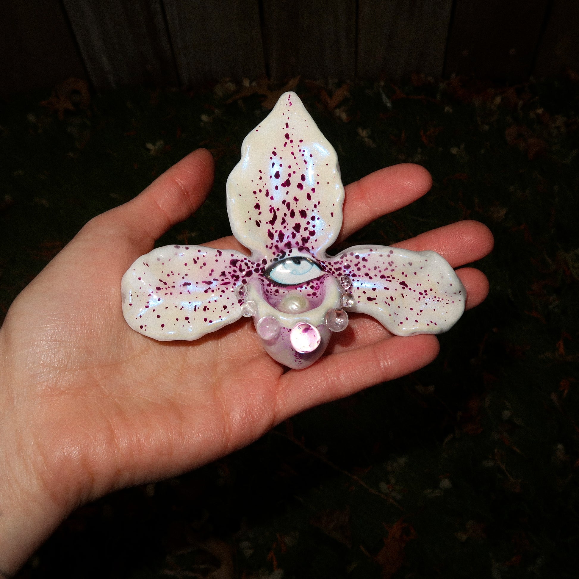 Each orchid is sculpted by hand from clay and painted layer by layer to capture its natural detail. The center of every flower holds my signature eye charm, a symbol of protection, and some designs are adorned with glass and pearls to enhance their earthy, organic look. Every piece is finished with resin for a smooth, glossy shine.