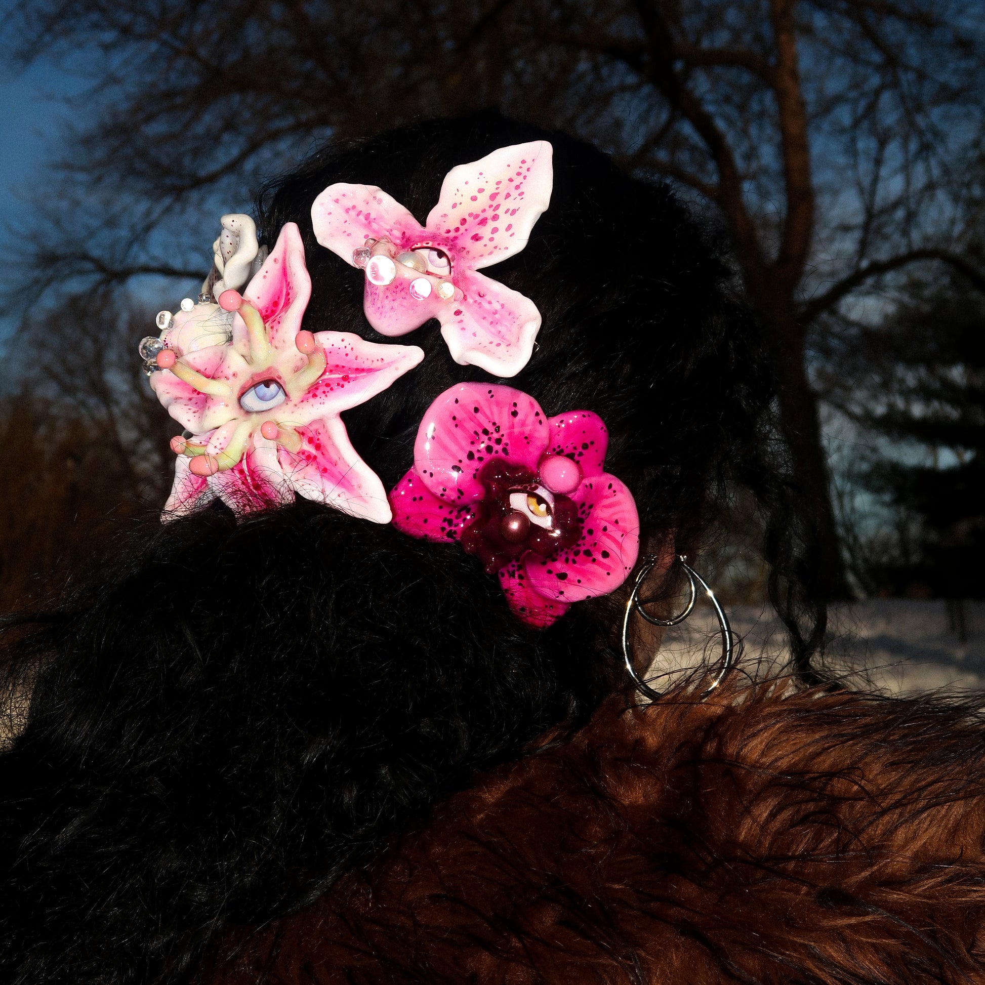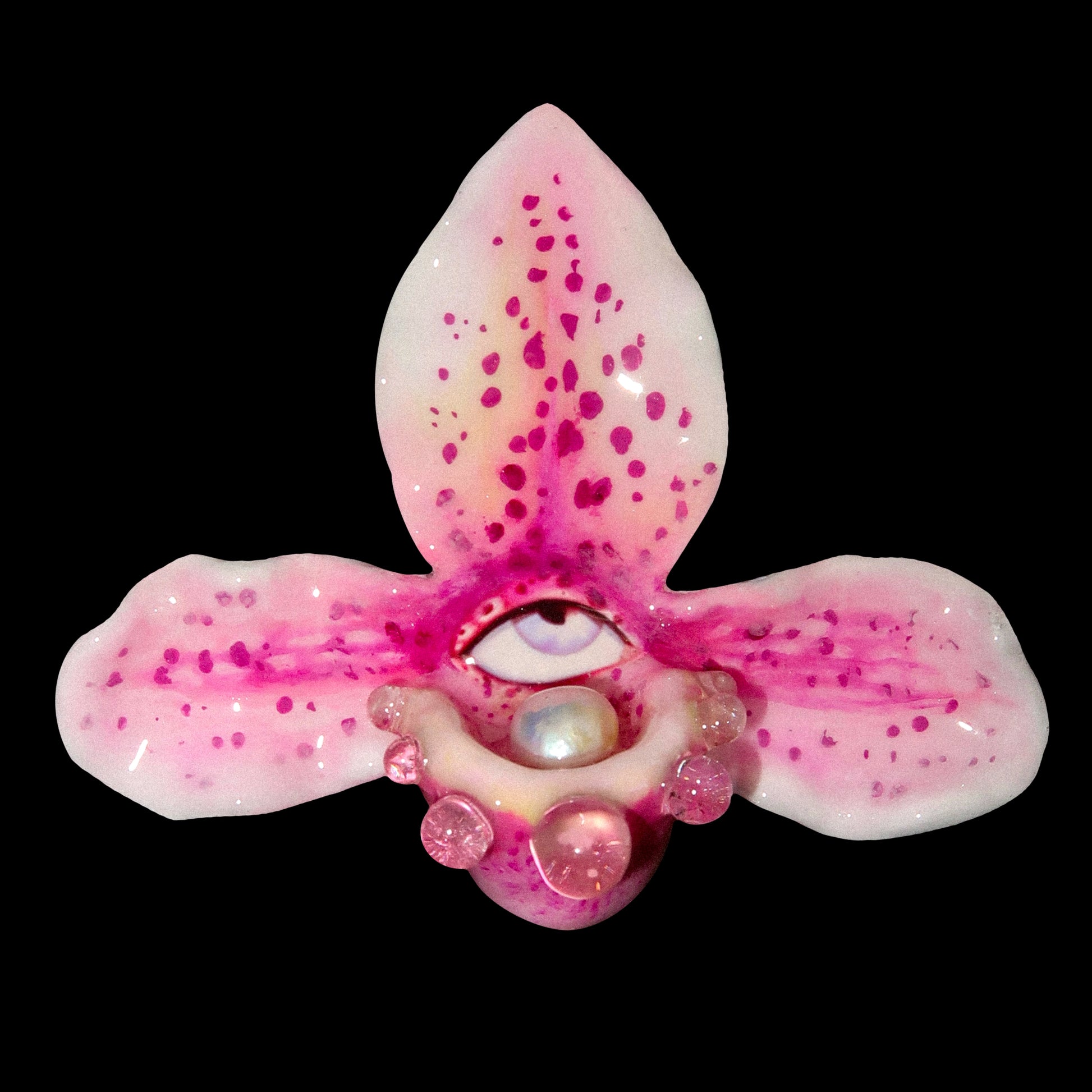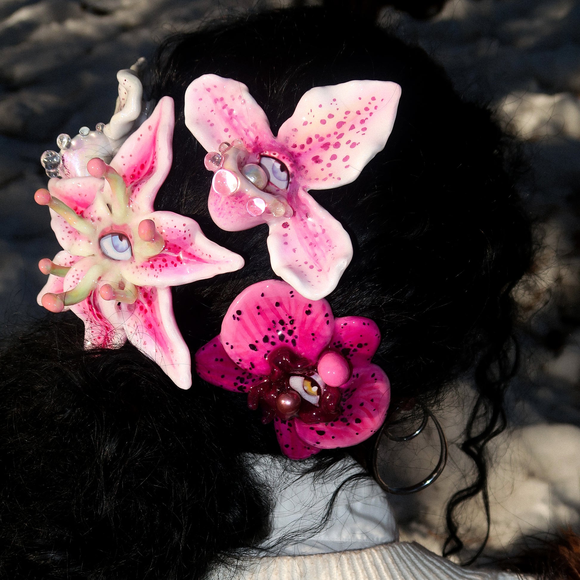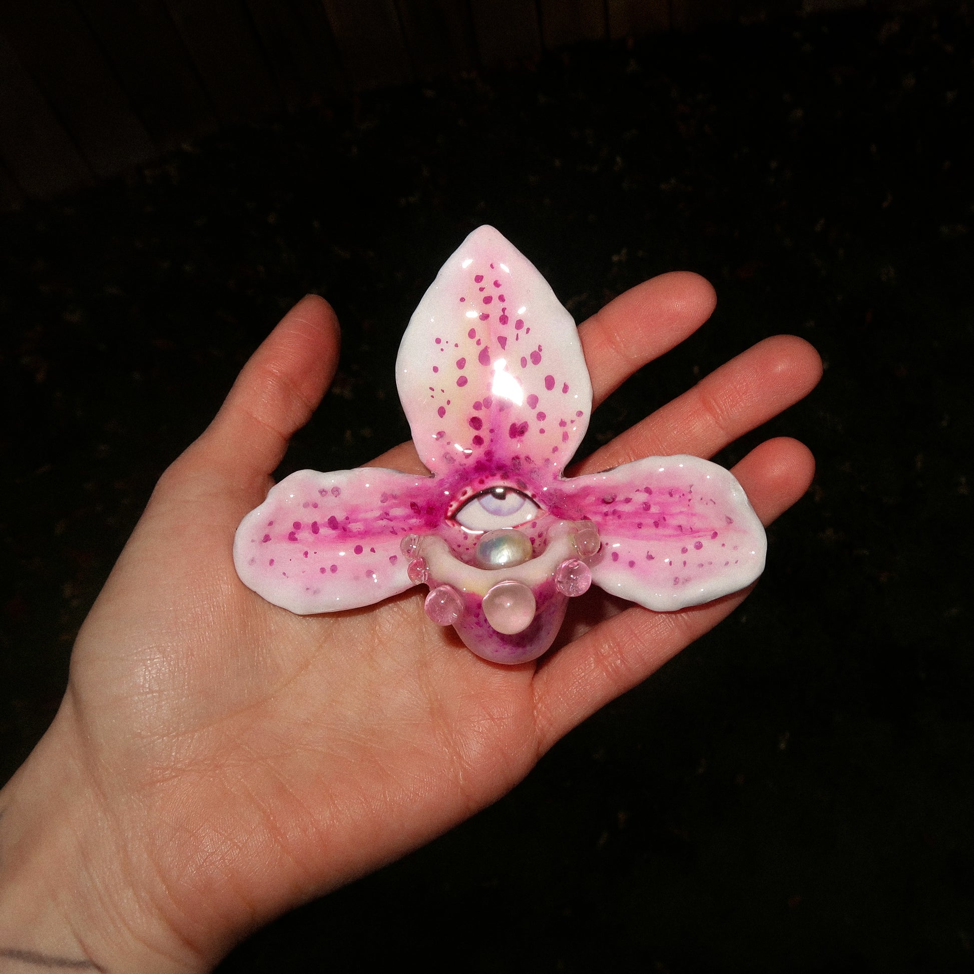Each orchid is sculpted by hand from clay and painted layer by layer to capture its natural detail. The center of every flower holds my signature eye charm, a symbol of protection, and some designs are adorned with glass and pearls to enhance their earthy, organic look. Every piece is finished with resin for a smooth, glossy shine.