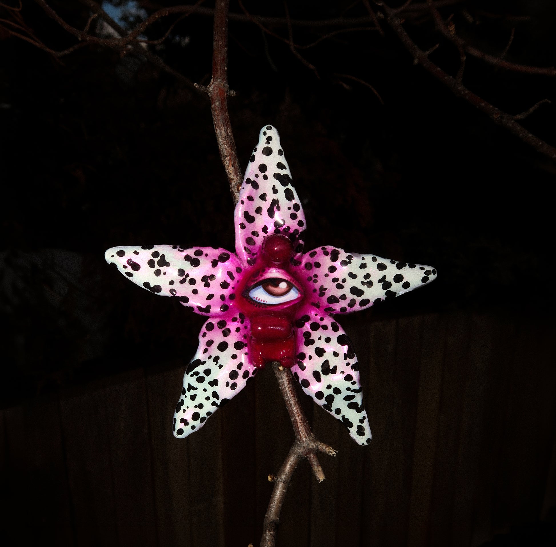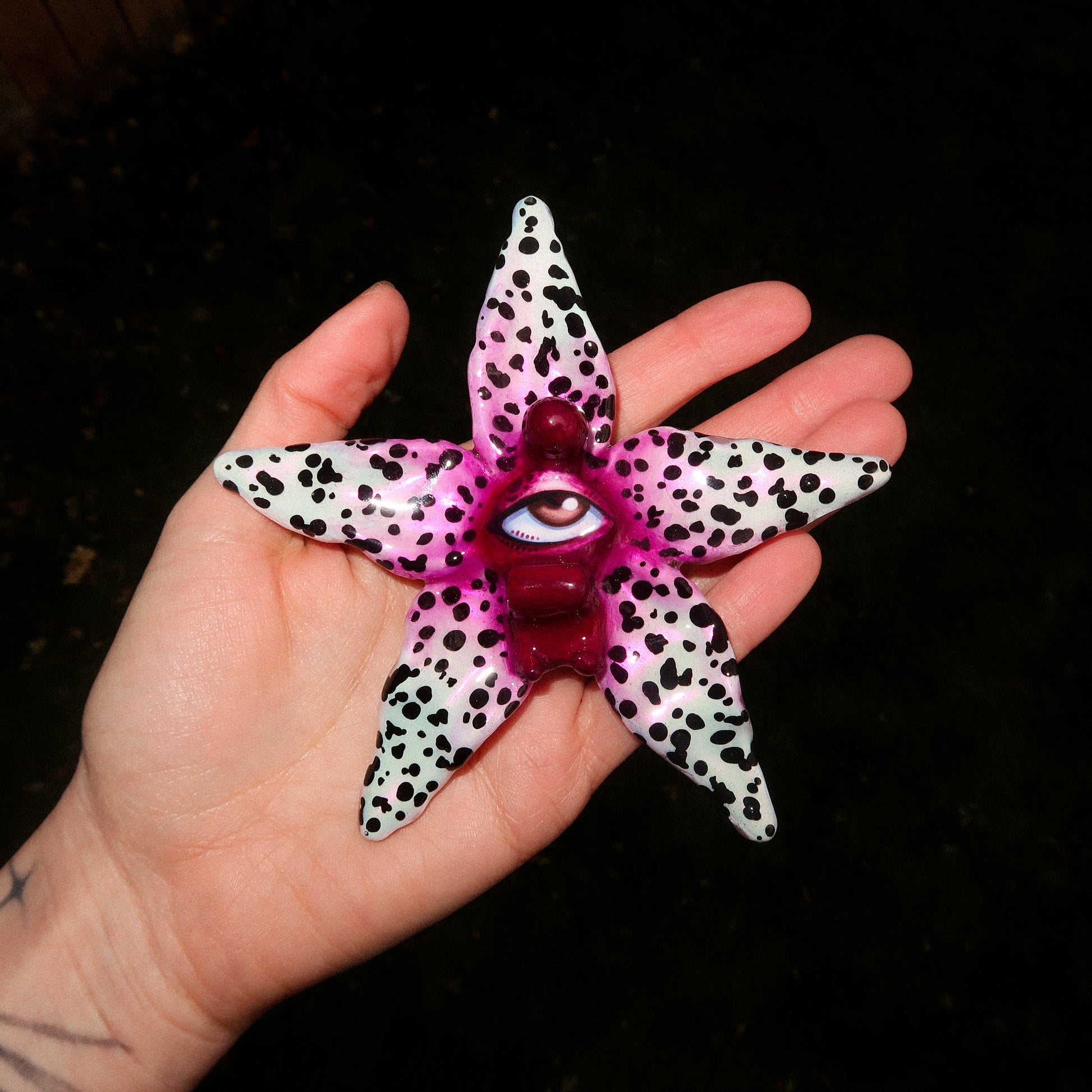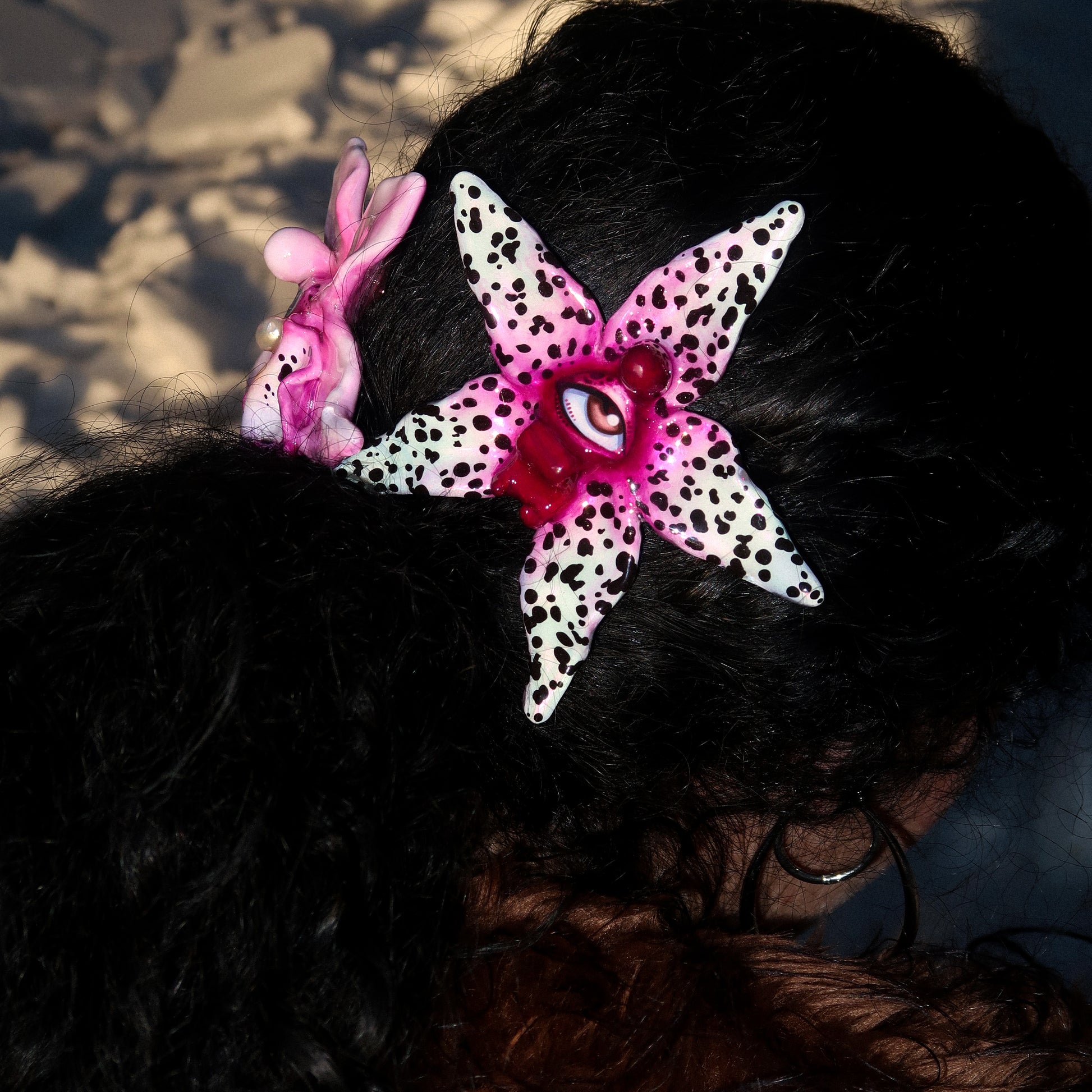 Each orchid is sculpted by hand from clay and painted layer by layer to capture its natural detail. The center of every flower holds my signature eye charm, a symbol of protection, and some designs are adorned with glass and pearls to enhance their earthy, organic look. Every piece is finished with resin for a smooth, glossy shine.