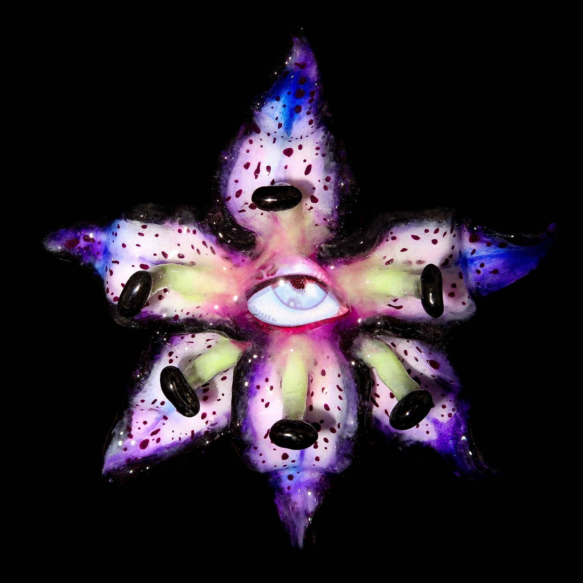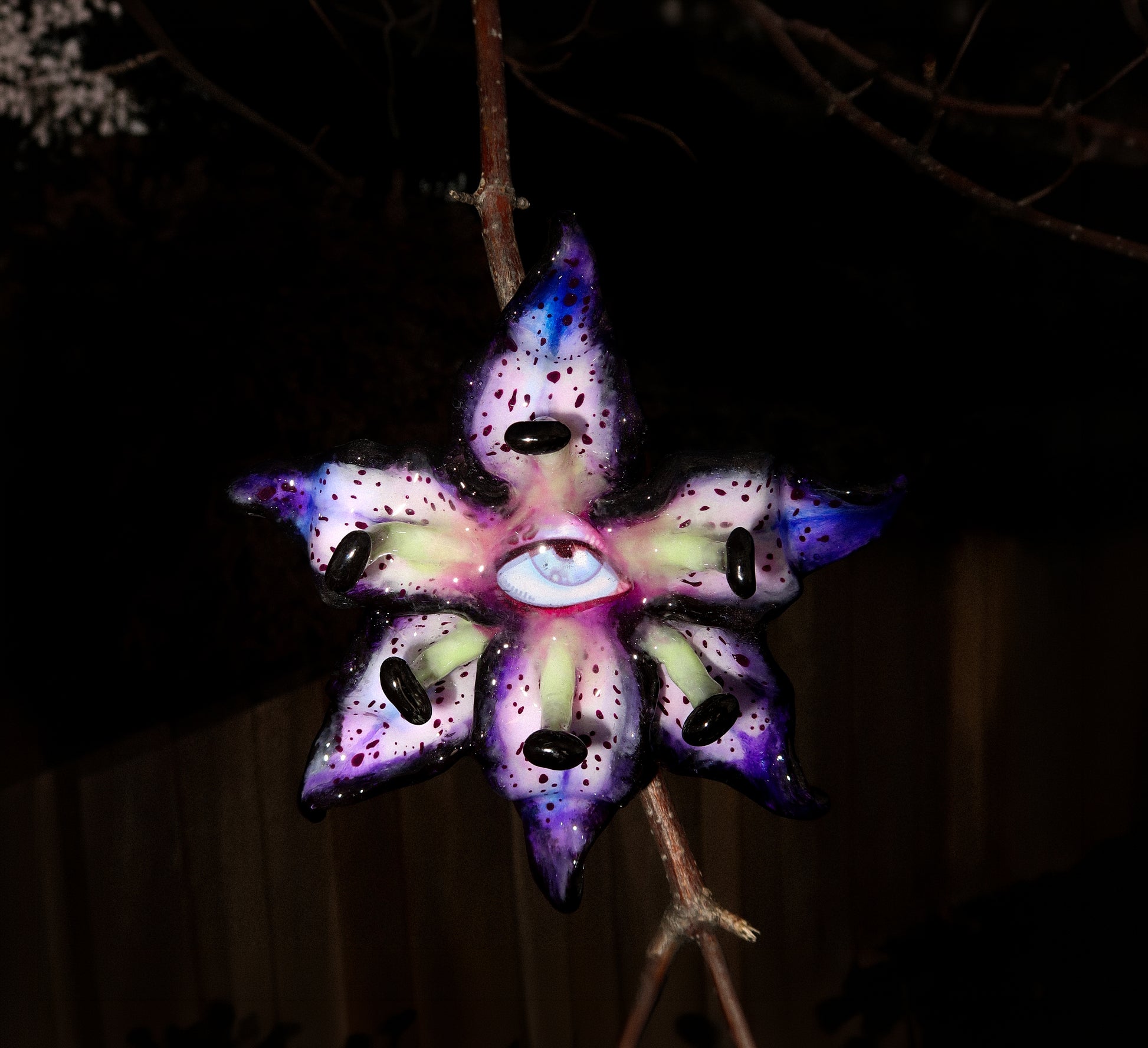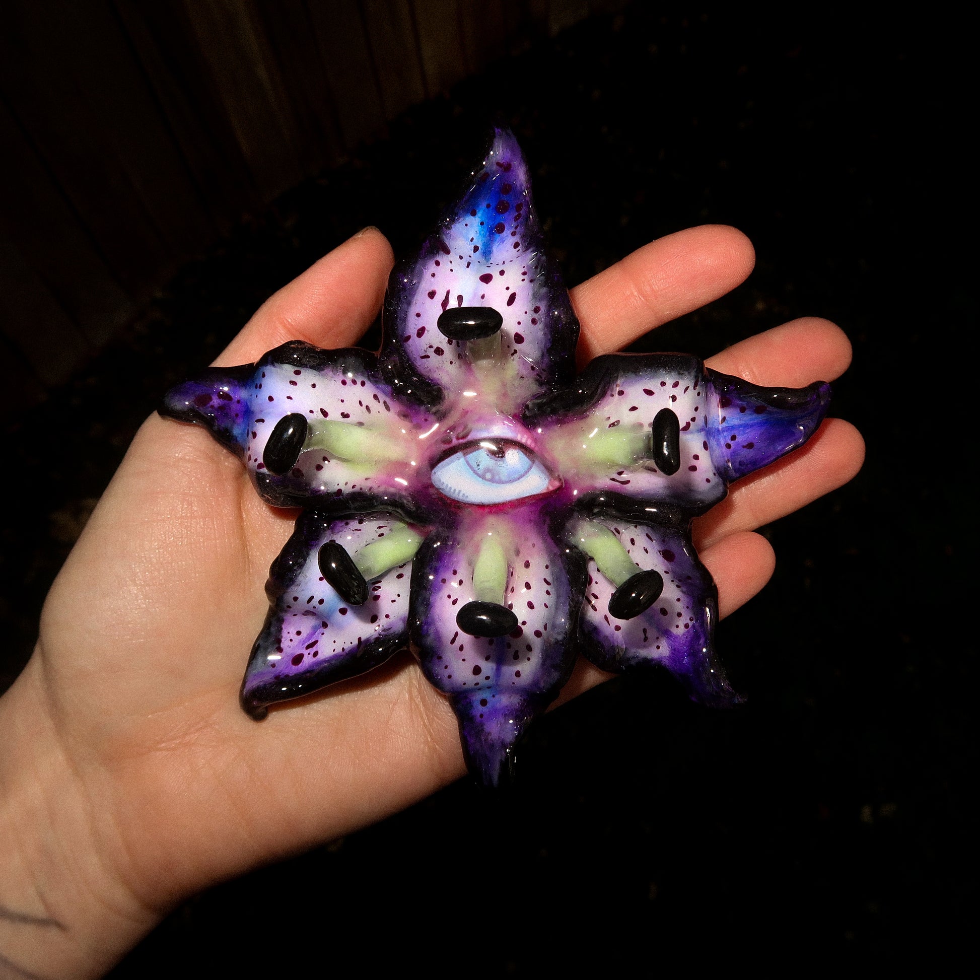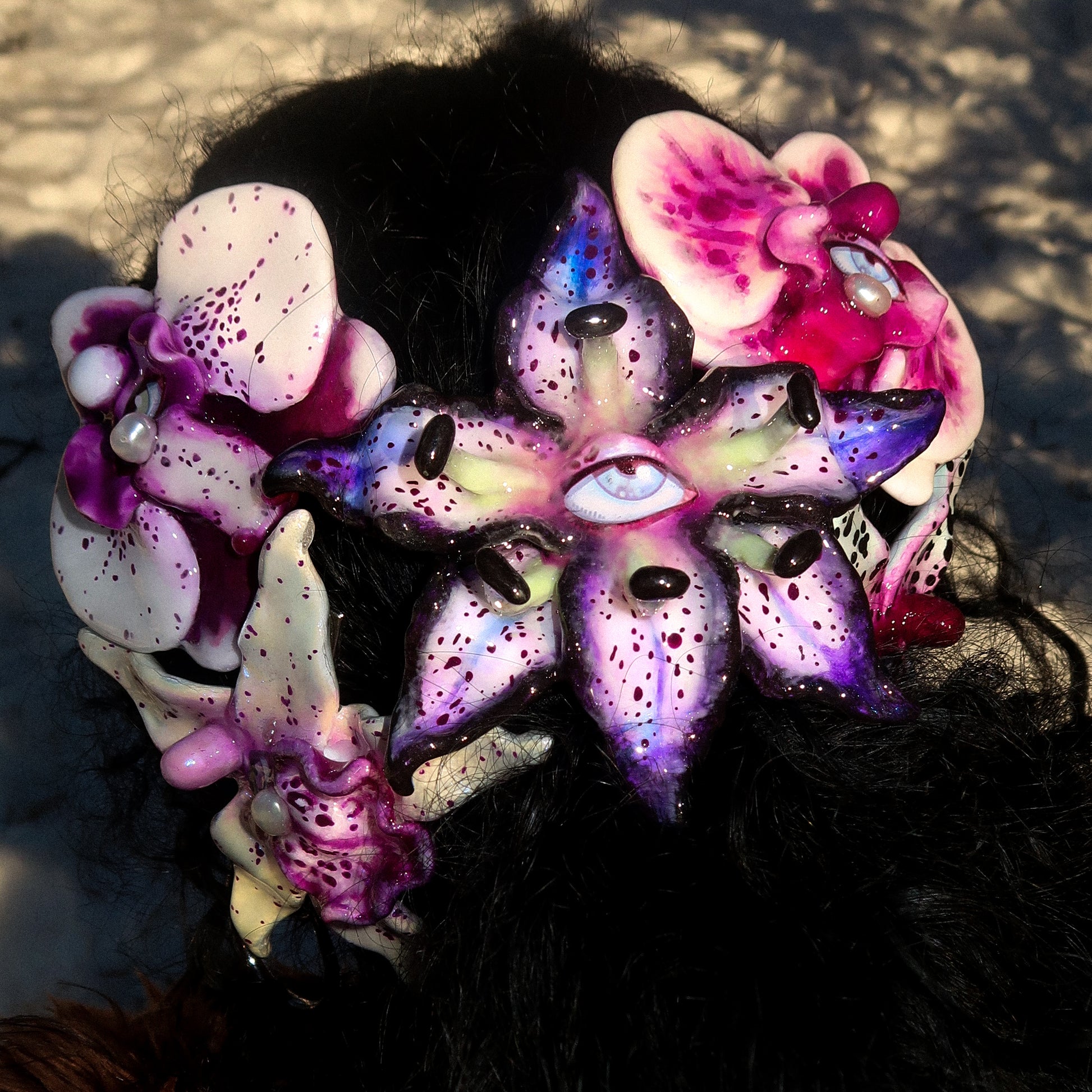 Each orchid is sculpted by hand from clay and painted layer by layer to capture its natural detail. The center of every flower holds my signature eye charm, a symbol of protection, and some designs are adorned with glass and pearls to enhance their earthy, organic look. Every piece is finished with resin for a smooth, glossy shine.